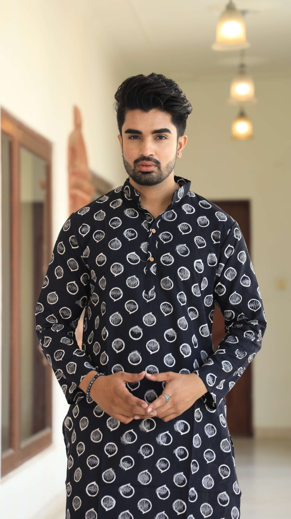 stylish Black printed cotton kurta set for men, paired Black with classic white pajama pants. Designed with a comfortable fit and elegant detailing, this kurta is perfect for festivals, weddings, parties, pooja ceremonies, and cultural celebrations. The breathable cotton fabric ensures comfort, while the subtle printed motifs add a touch of sophistication. Pair it with leather sandals or juttis to complete your traditional look.