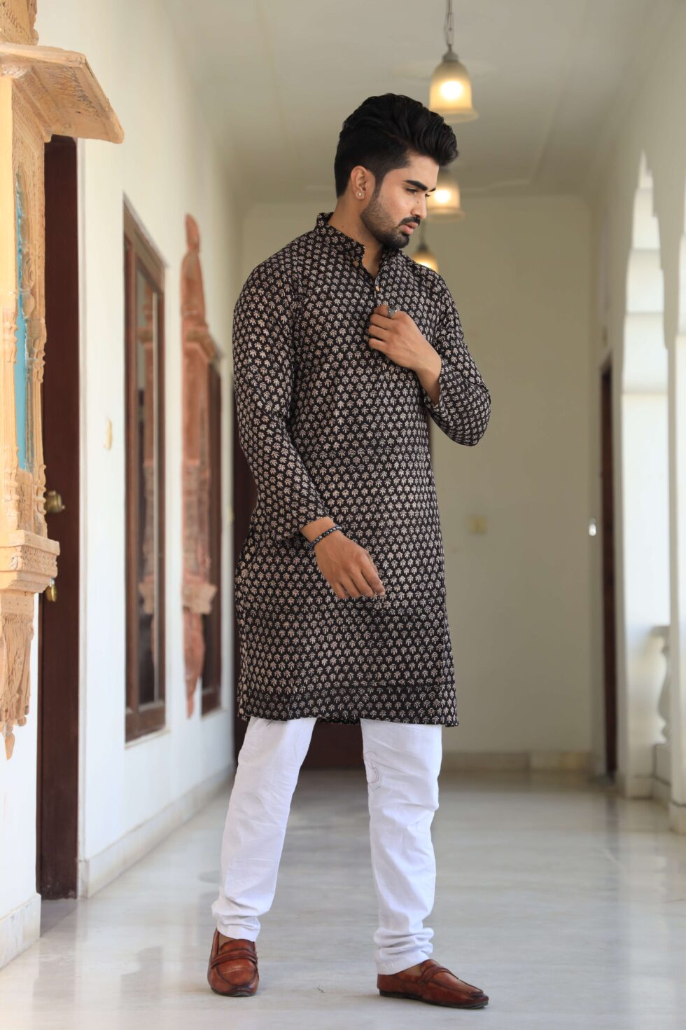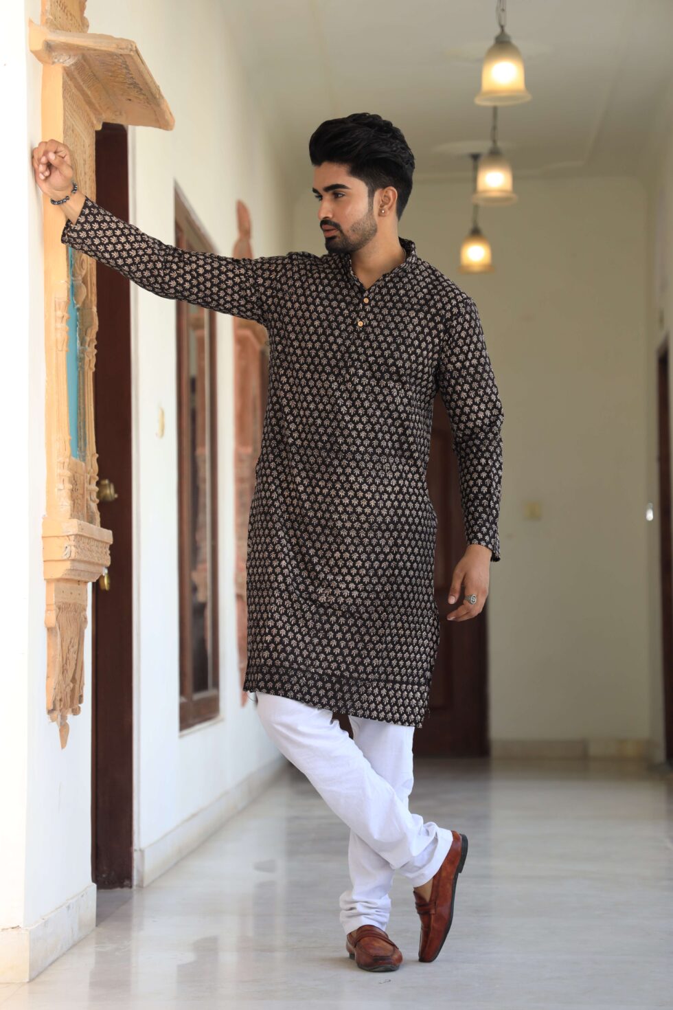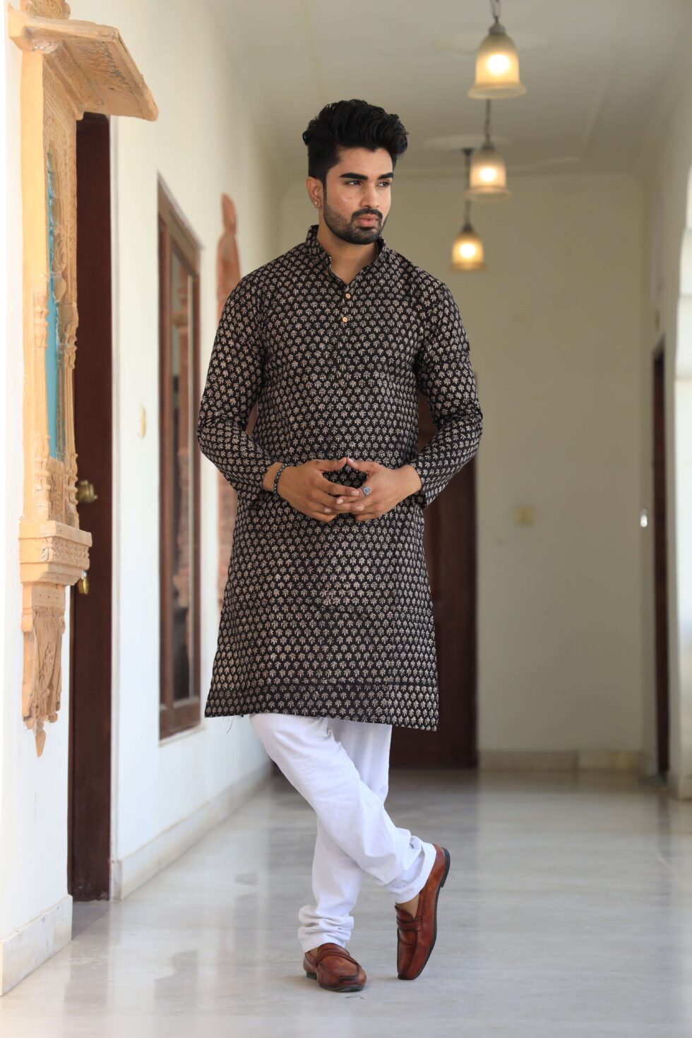 stylish Black printed cotton kurta set for men, paired Black with classic white pajama pants. Designed with a comfortable fit and elegant detailing, this kurta is perfect for festivals, weddings, parties, pooja ceremonies, and cultural celebrations. The breathable cotton fabric ensures comfort, while the subtle printed motifs add a touch of sophistication. Pair it with leather sandals or juttis to complete your traditional look.