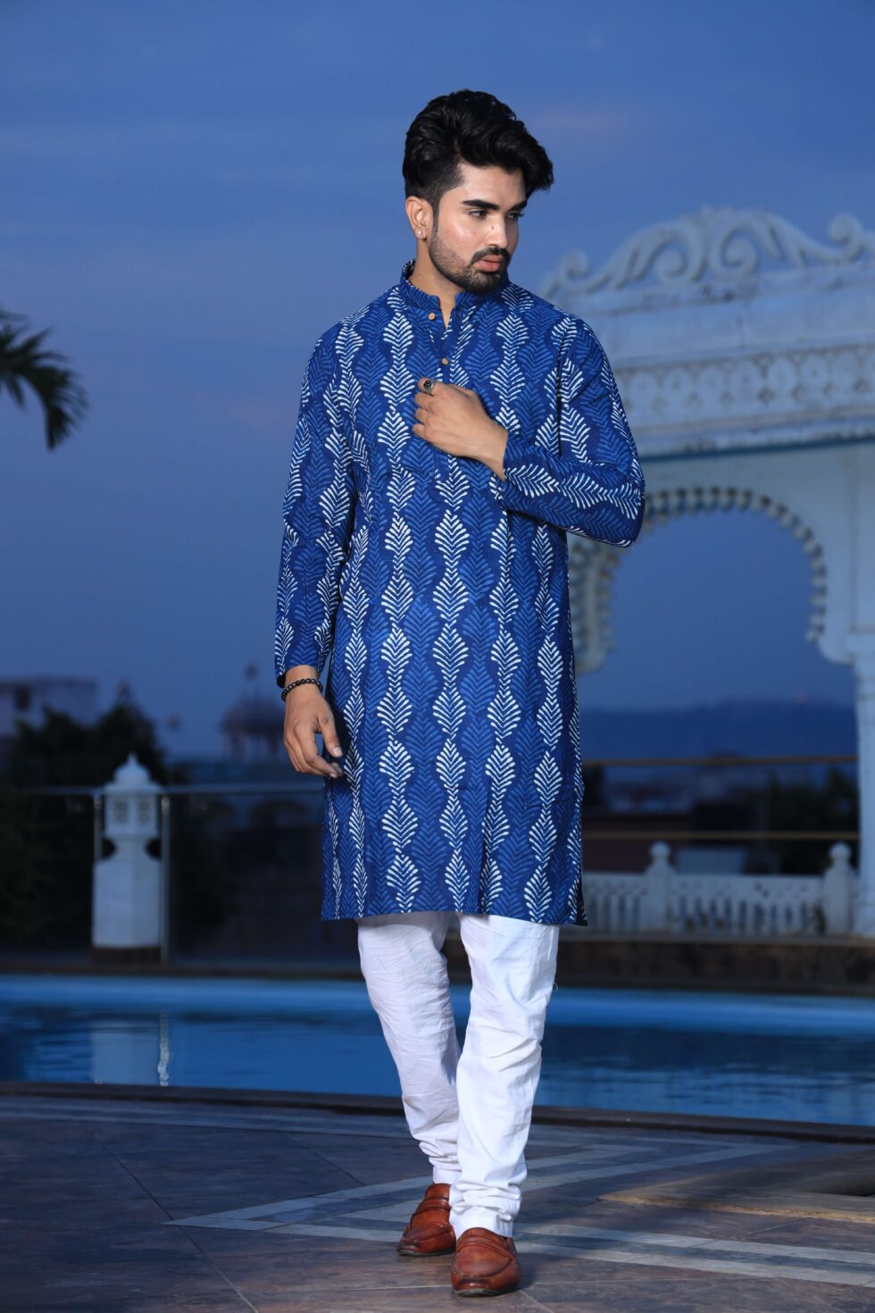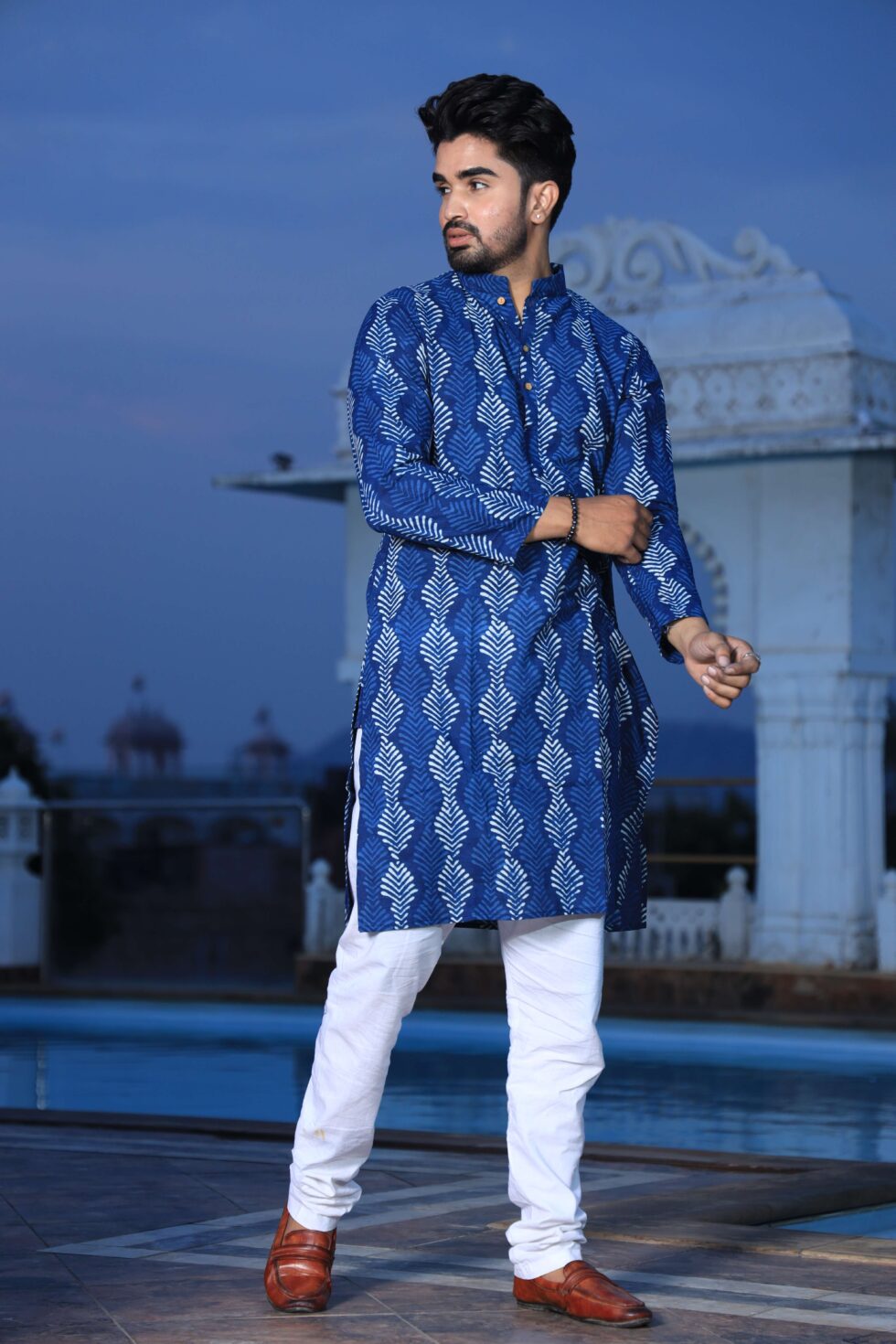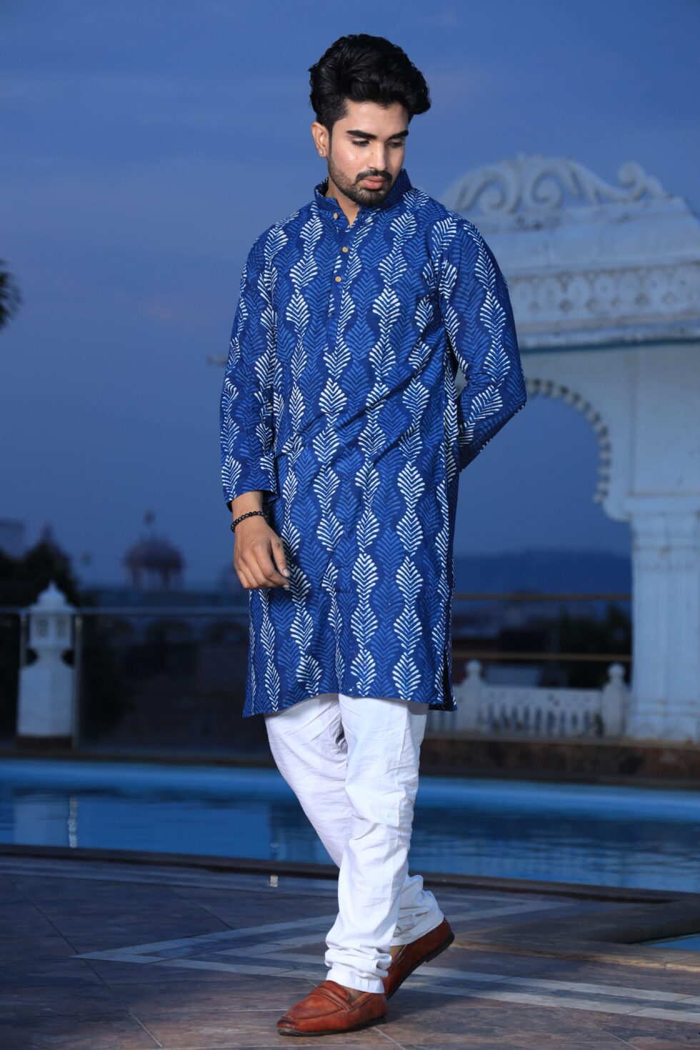 Mens Blue Handblock Printed Cotton Kurta with White Pajama ? Stylish Ethnic & Festive Wear