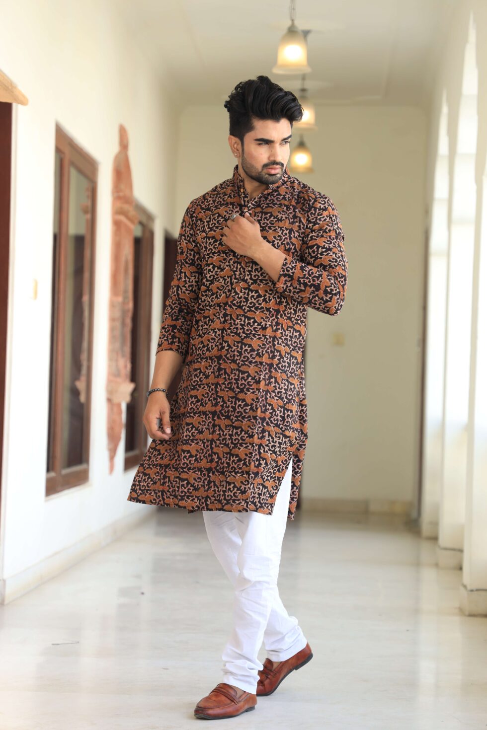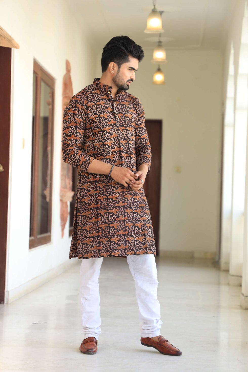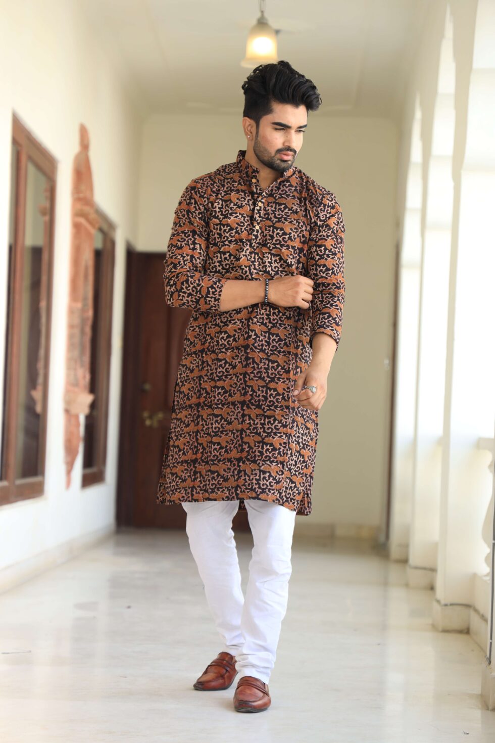 stylish Brown & Black printed cotton kurta set for men, paired Brown & Black with classic white pajama pants. Designed with a comfortable fit and elegant detailing, this kurta is perfect for festivals, weddings, parties, pooja ceremonies, and cultural celebrations. The breathable cotton fabric ensures comfort, while the subtle printed motifs add a touch of sophistication. Pair it with leather sandals or juttis to complete your traditional look.