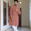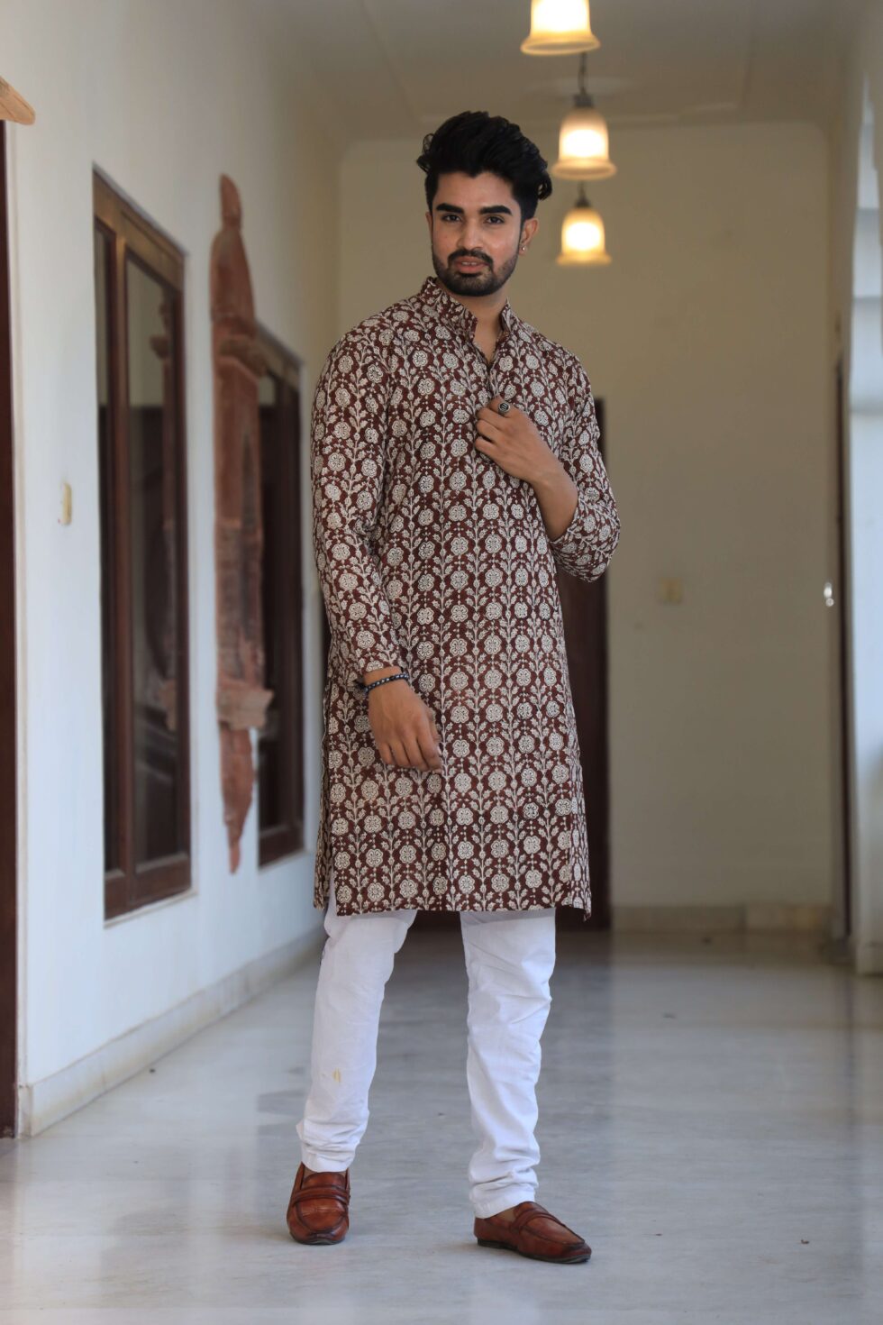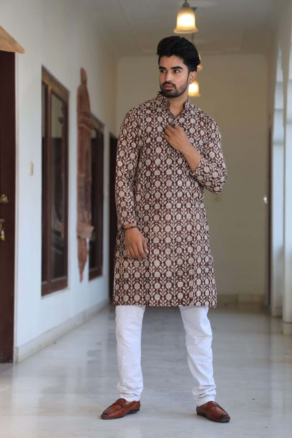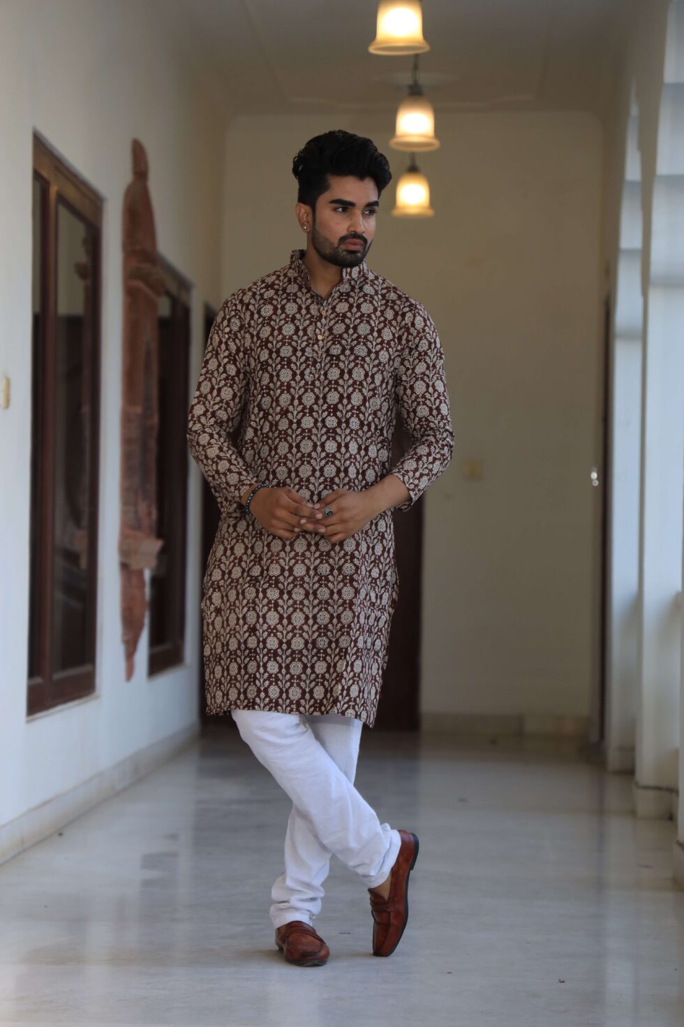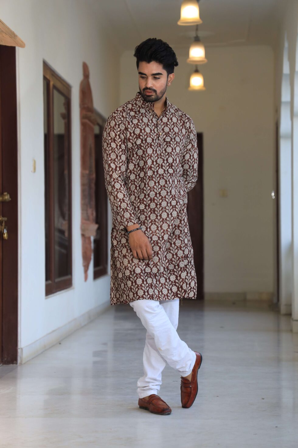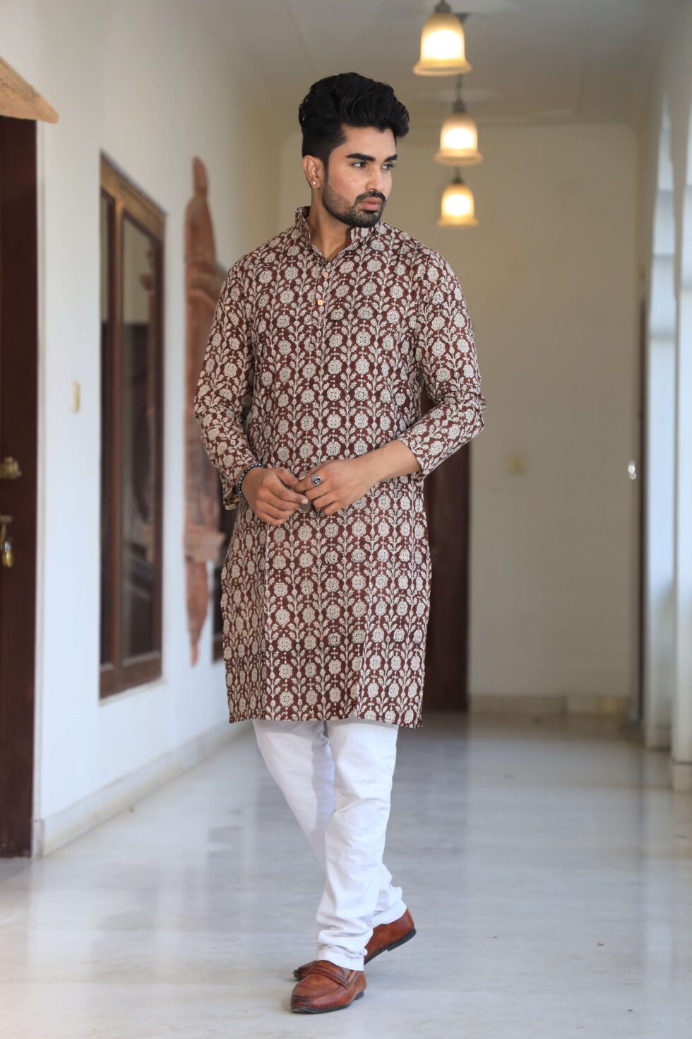 stylish Brown Floral printed cotton kurta set for men, paired with classic white pajama pants. Designed with a comfortable fit and elegant detailing, this kurta is perfect for festivals, weddings, parties, pooja ceremonies, and cultural celebrations. The breathable cotton fabric ensures comfort, while the subtle printed motifs add a touch of sophistication. Pair it with leather sandals or juttis to complete your traditional look.