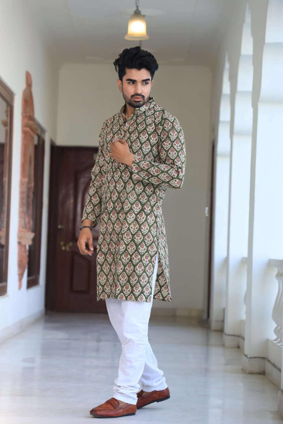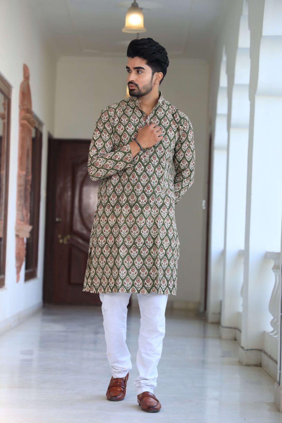 Mens Green Printed Cotton Kurta with White Pajama ? Traditional Festive & Casual Wear