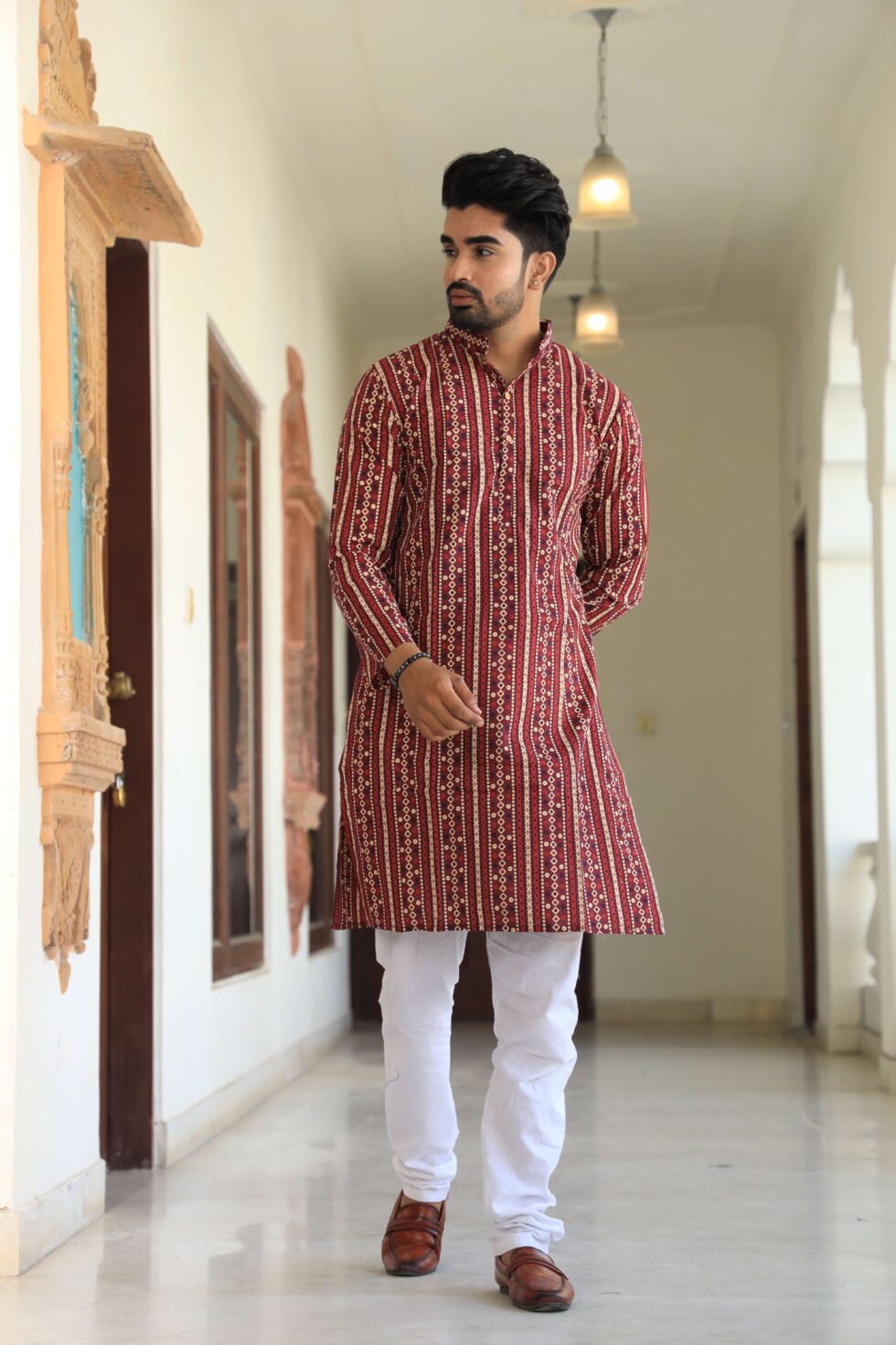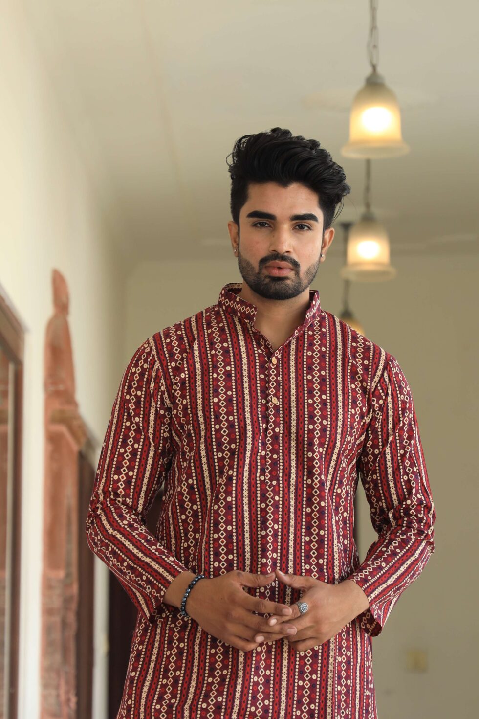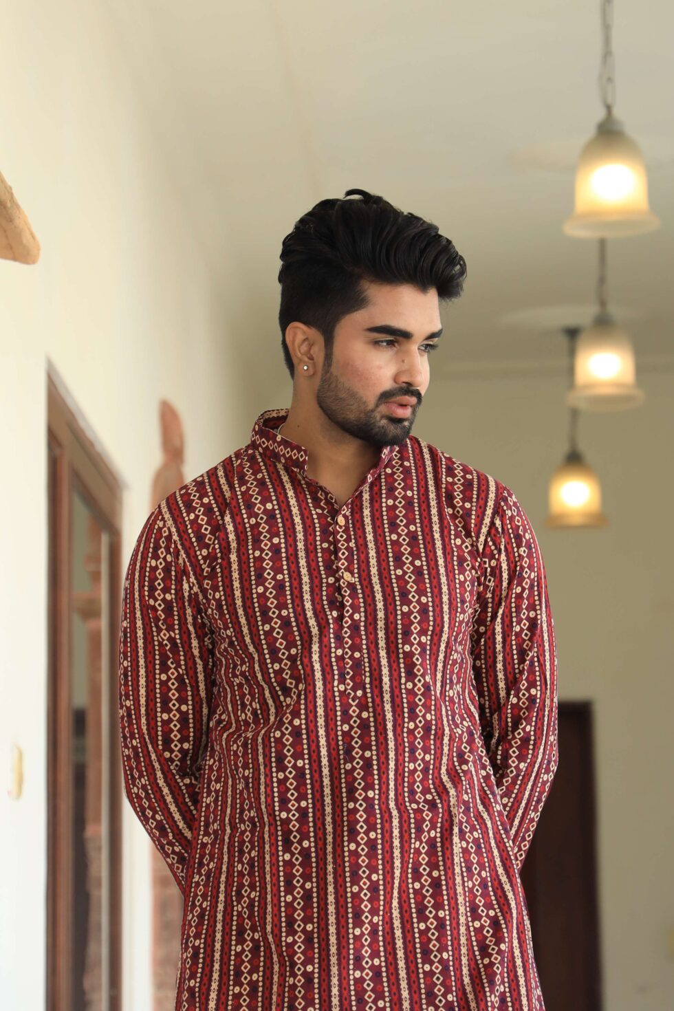 stylish Maroon Striped printed cotton kurta set for men, paired Maroon Striped with classic white pajama pants. Designed with a comfortable fit and elegant detailing, this kurta is perfect for festivals, weddings, parties, pooja ceremonies, and cultural celebrations. The breathable cotton fabric ensures comfort, while the subtle printed motifs add a touch of sophistication. Pair it with leather sandals or juttis to complete your traditional look.