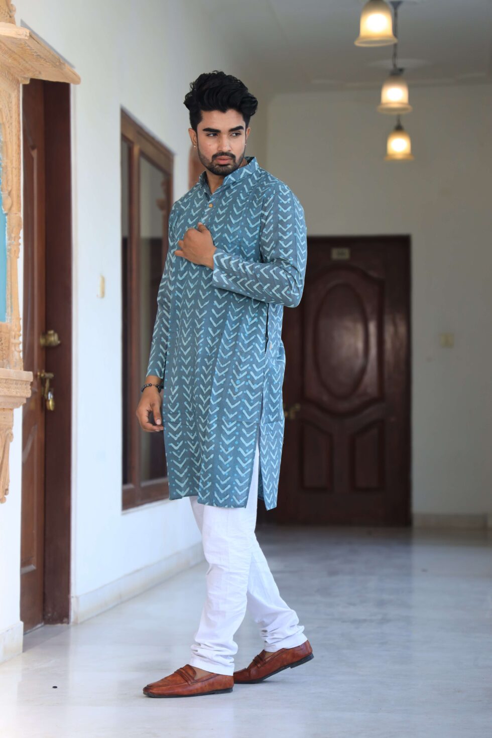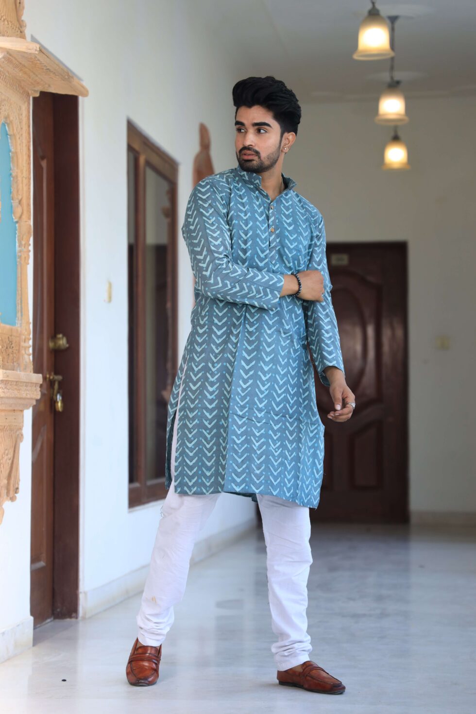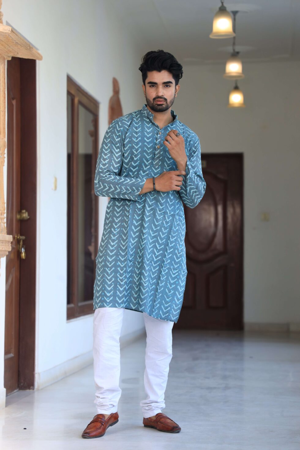 stylish Multicolor Zig-Zag printed cotton kurta set for men, paired Multicolor Zig-Zag with classic white pajama pants. Designed with a comfortable fit and elegant detailing, this kurta is perfect for festivals, weddings, parties, pooja ceremonies, and cultural celebrations. The breathable cotton fabric ensures comfort, while the subtle printed motifs add a touch of sophistication. Pair it with leather sandals or juttis to complete your traditional look.
