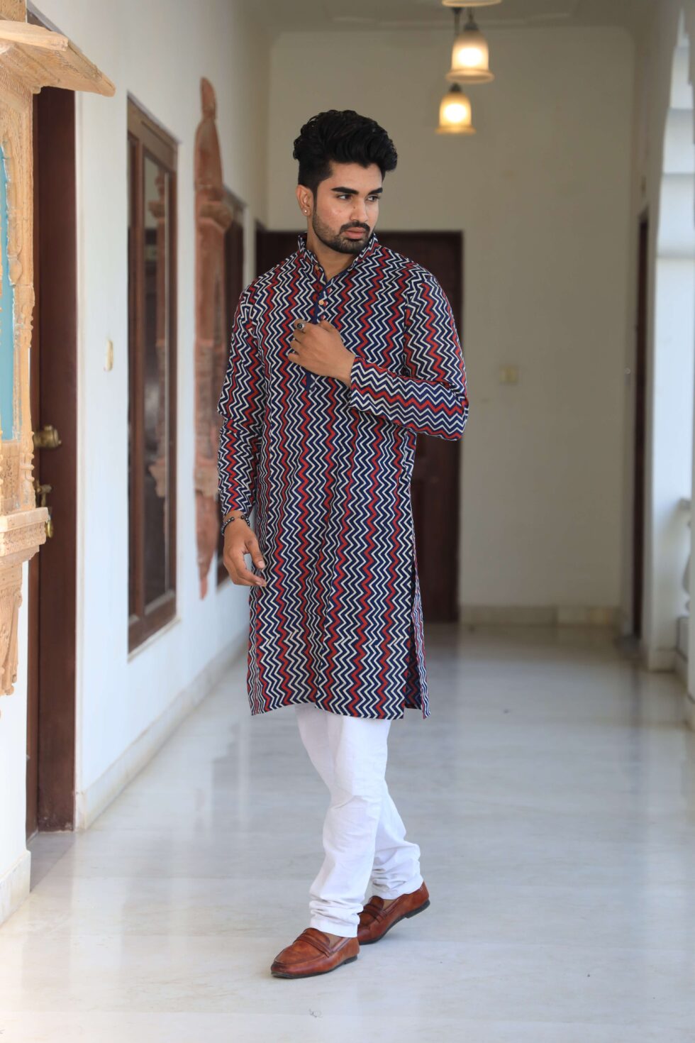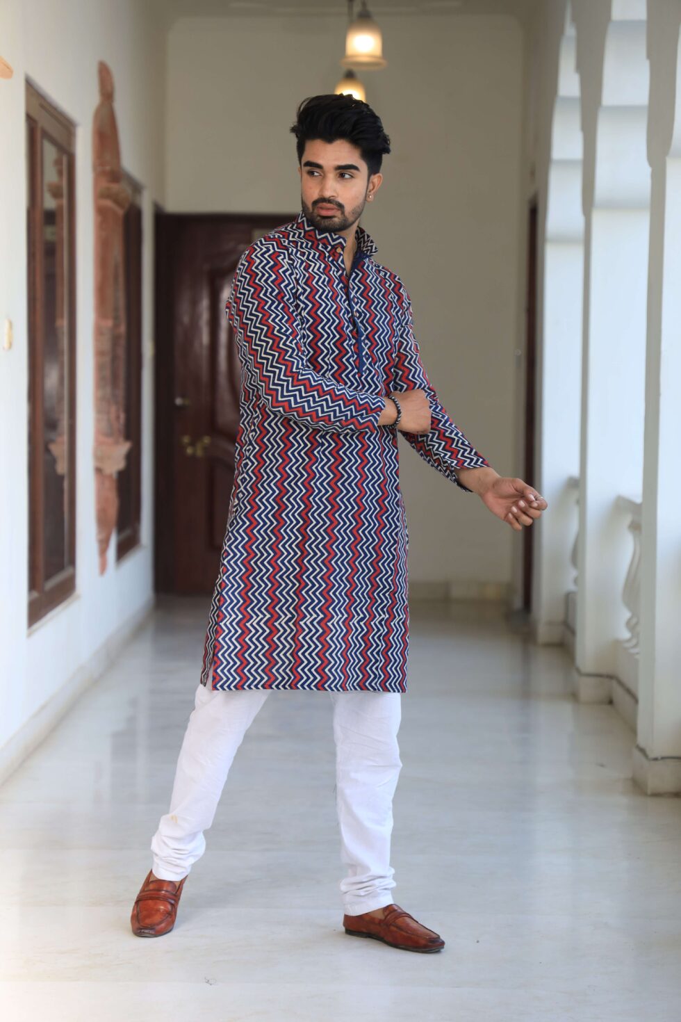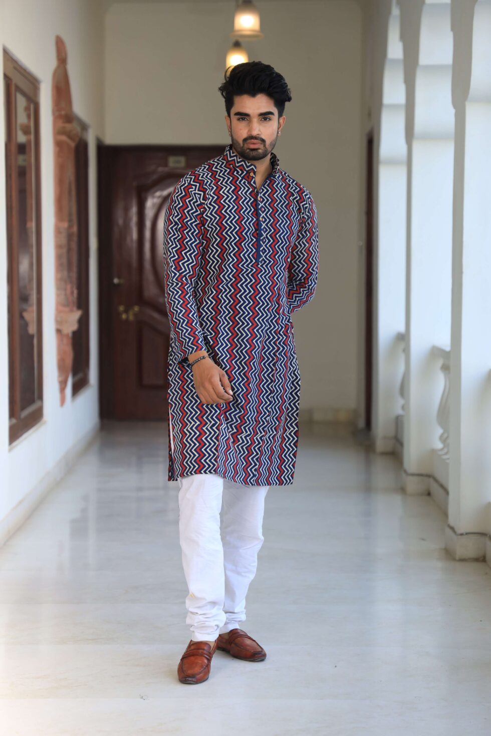stylish Multicolor Zig-Zag printed cotton kurta set for men, paired Multicolor Zig-Zag with classic white pajama pants. Designed with a comfortable fit and elegant detailing, this kurta is perfect for festivals, weddings, parties, pooja ceremonies, and cultural celebrations. The breathable cotton fabric ensures comfort, while the subtle printed motifs add a touch of sophistication. Pair it with leather sandals or juttis to complete your traditional look.