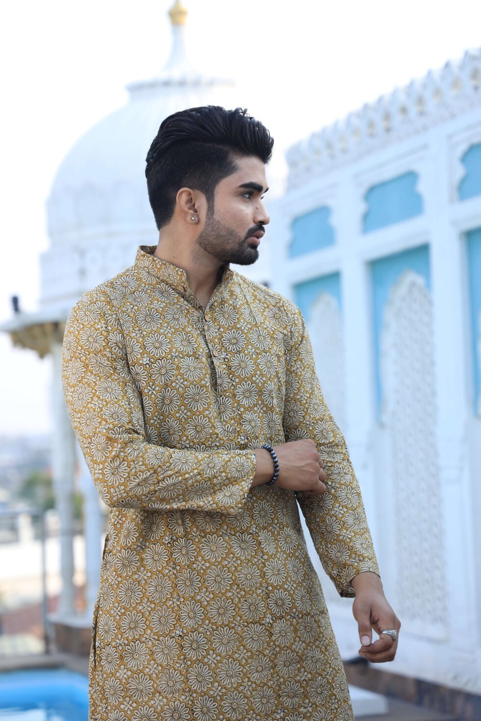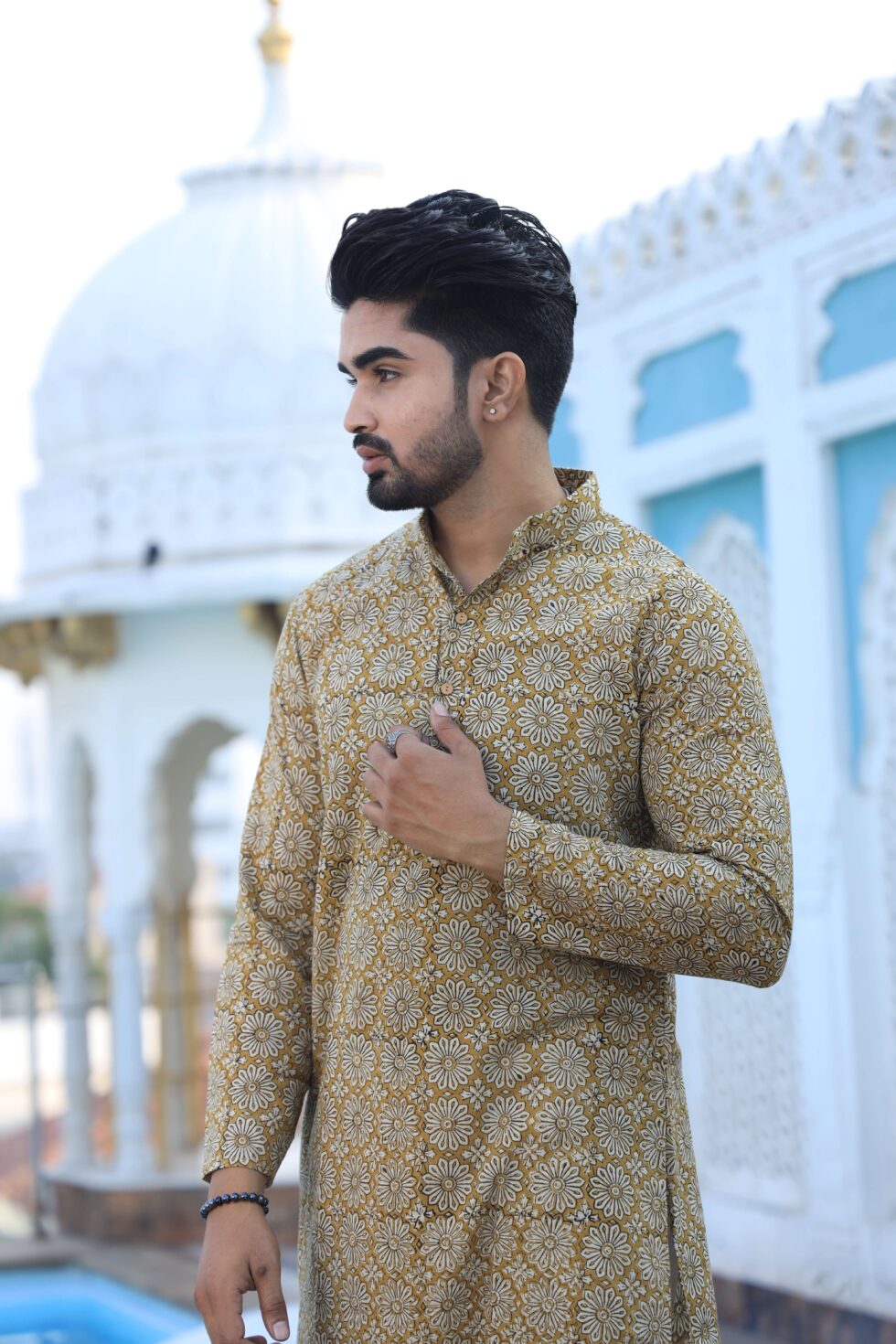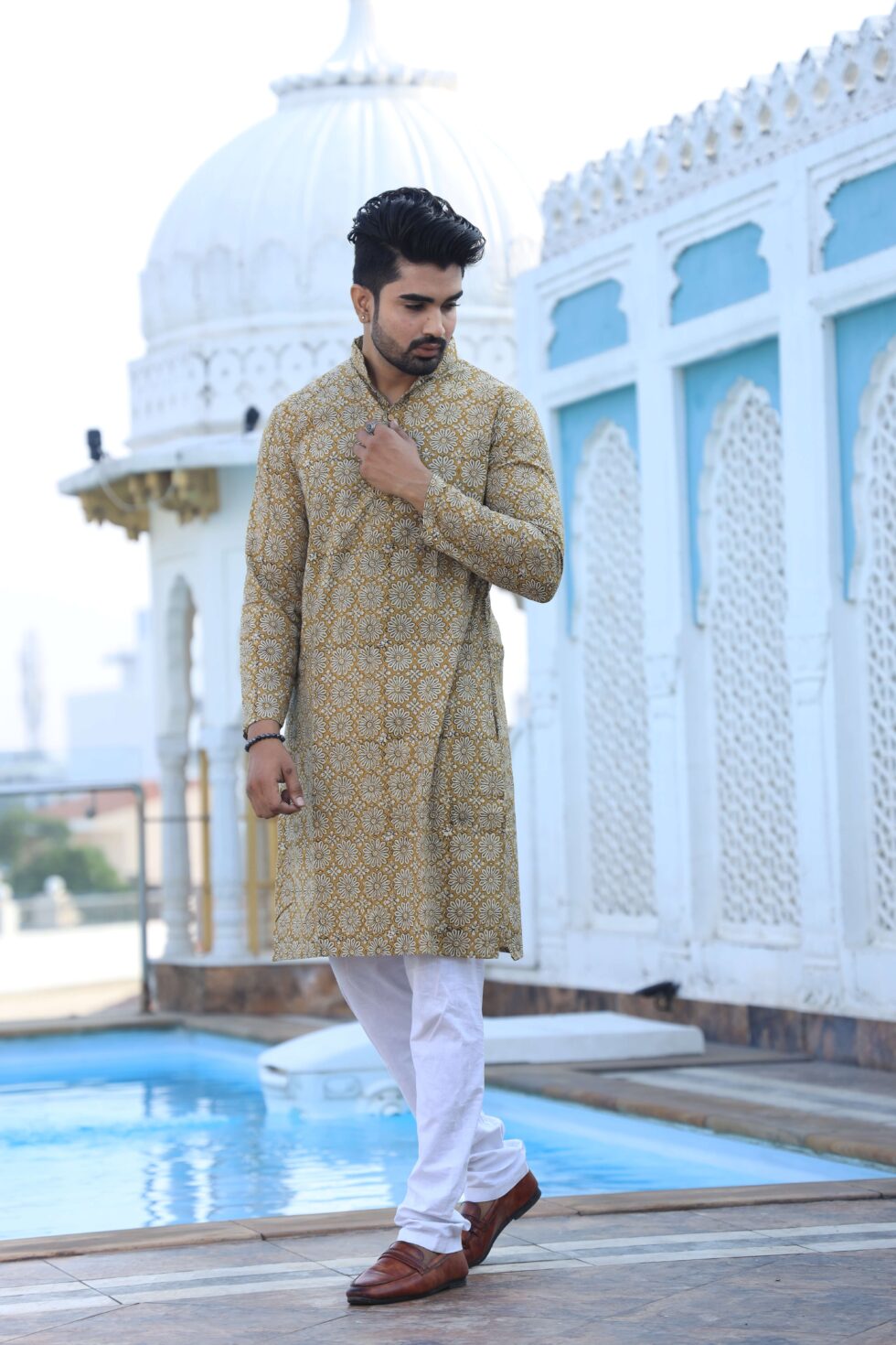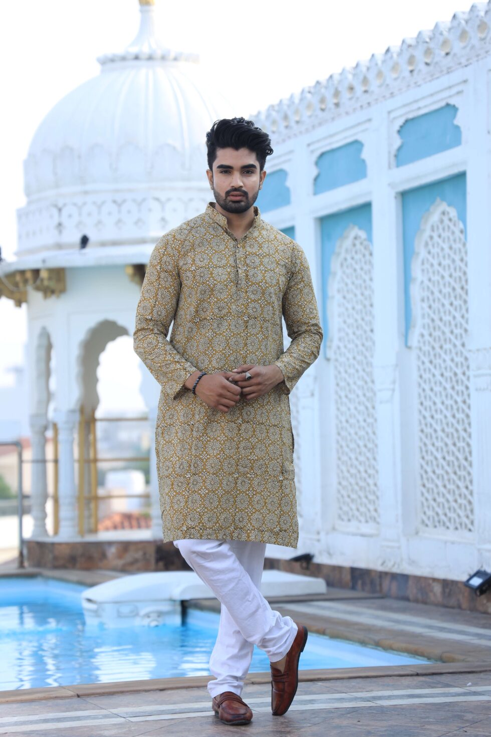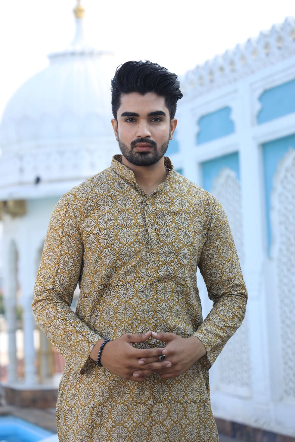 stylish Mustard Yellow Handblock printed cotton kurta set for men, paired with classic white pajama pants. Designed with a comfortable fit and elegant detailing, this kurta is perfect for festivals, weddings, parties, pooja ceremonies, and cultural celebrations. The breathable cotton fabric ensures comfort, while the subtle printed motifs add a touch of sophistication. Pair it with leather sandals or juttis to complete your traditional look.