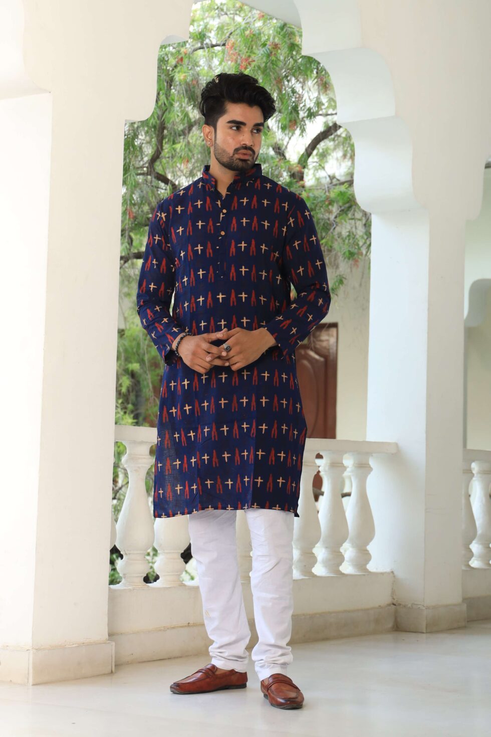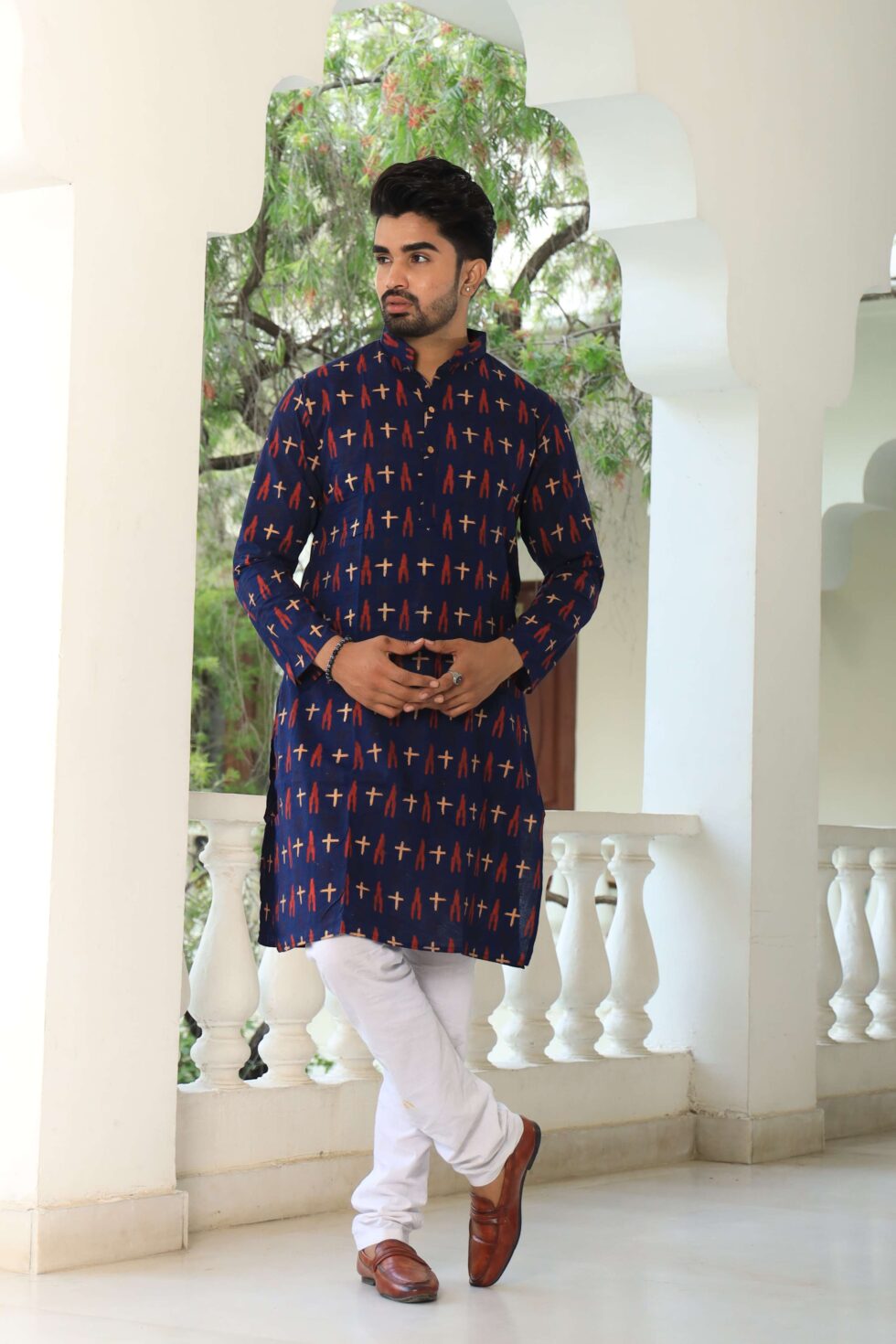 stylish navy blue printed cotton kurta set for men, paired with classic white pajama pants. Designed with a comfortable fit and elegant detailing, this kurta is perfect for festivals, weddings, parties, pooja ceremonies, and cultural celebrations. The breathable cotton fabric ensures comfort, while the subtle printed motifs add a touch of sophistication. Pair it with leather sandals or juttis to complete your traditional look.