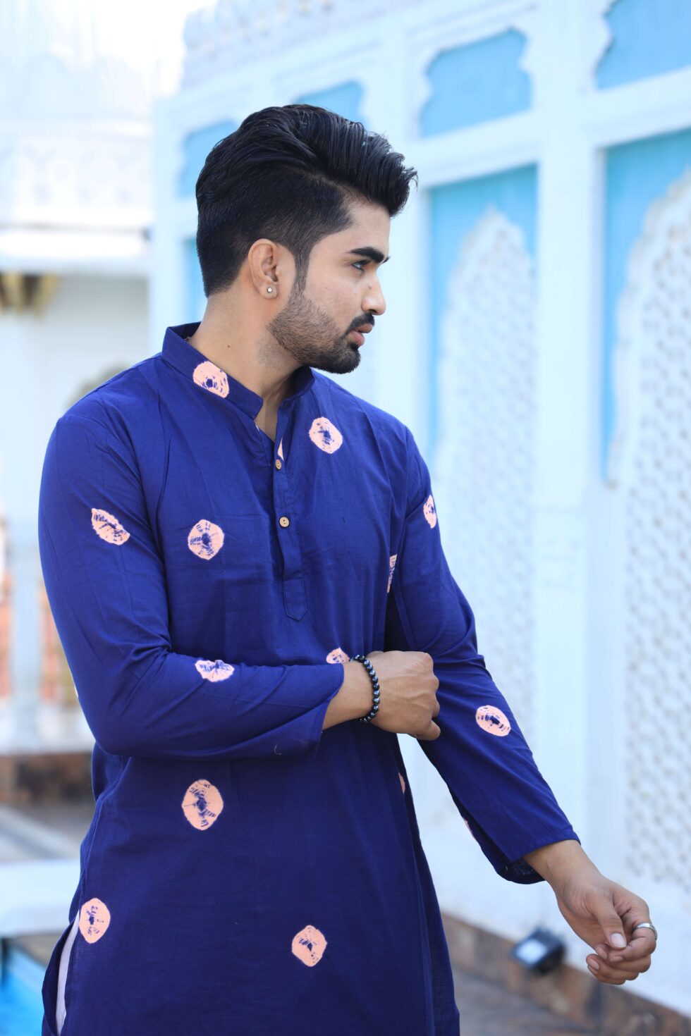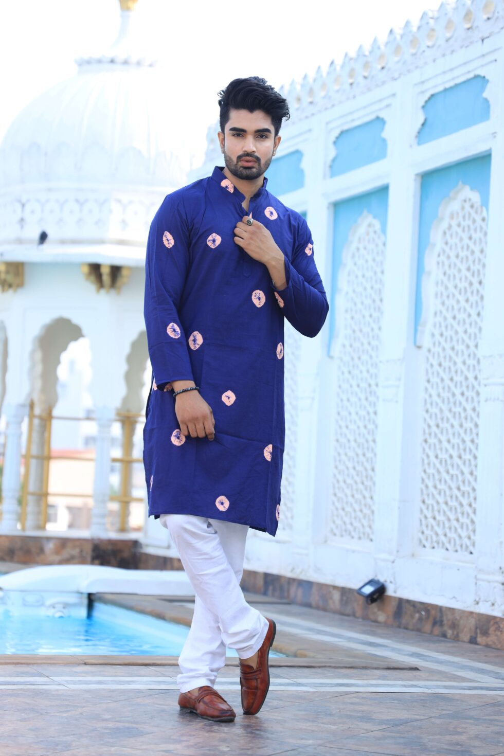 stylish navy blue printed cotton kurta set for men, paired with classic white pajama pants. Designed with a comfortable fit and elegant detailing, this kurta is perfect for festivals, weddings, parties, pooja ceremonies, and cultural celebrations. The breathable cotton fabric ensures comfort, while the subtle printed motifs add a touch of sophistication. Pair it with leather sandals or juttis to complete your traditional look.