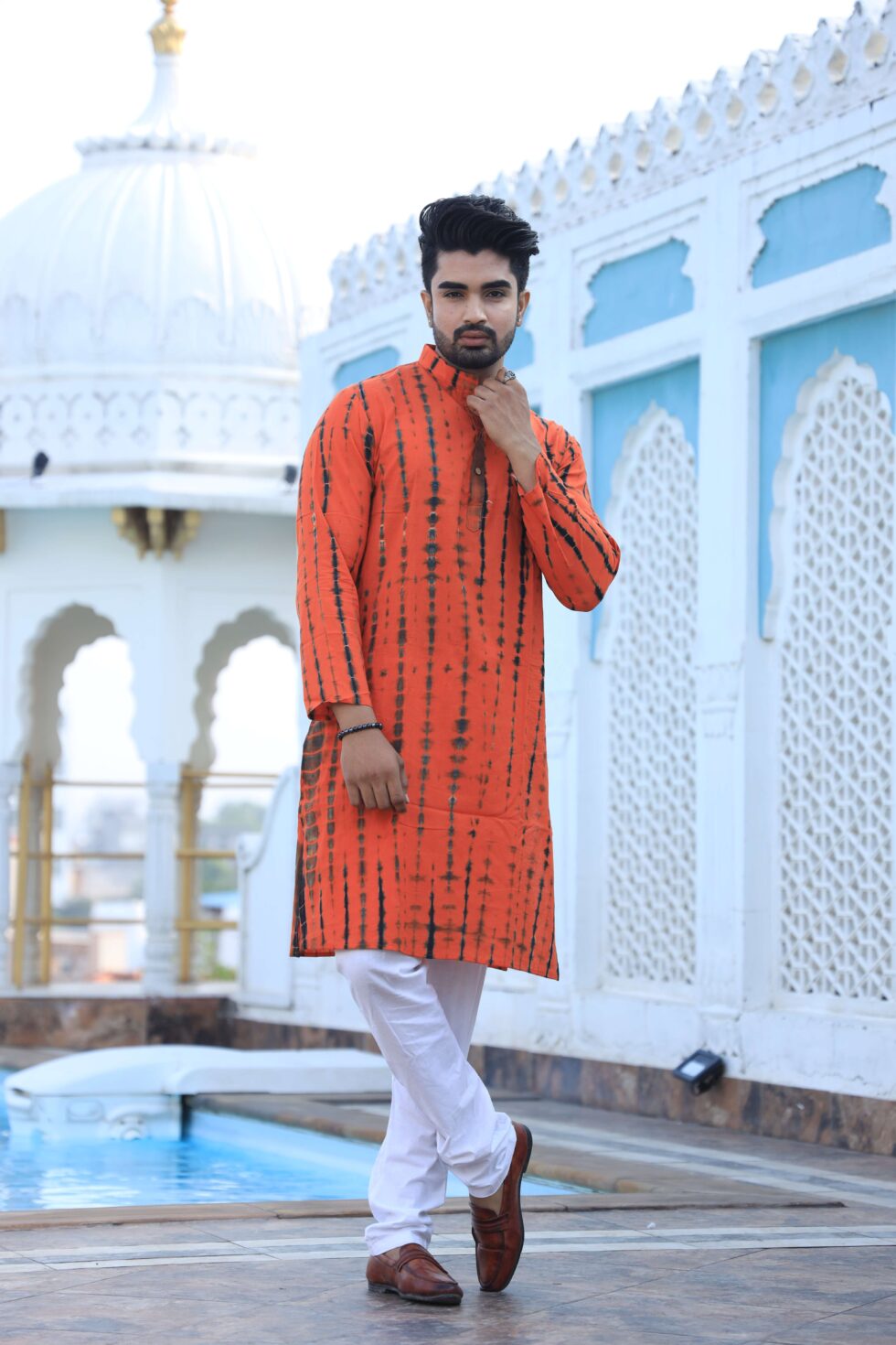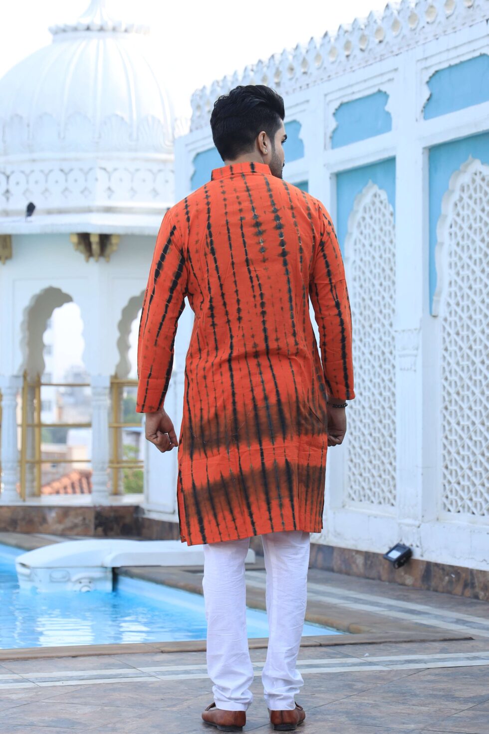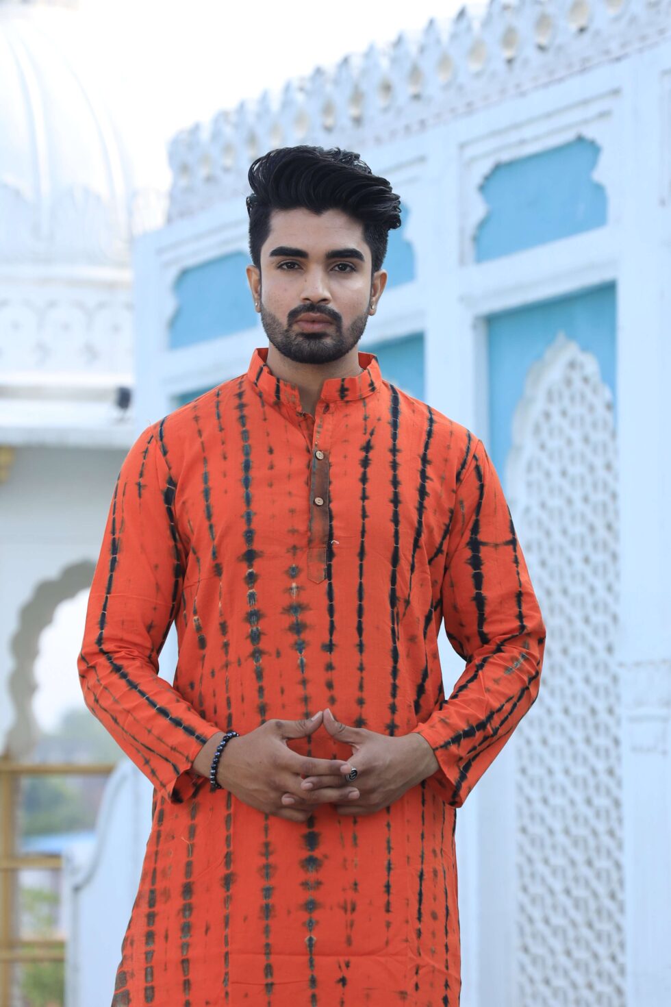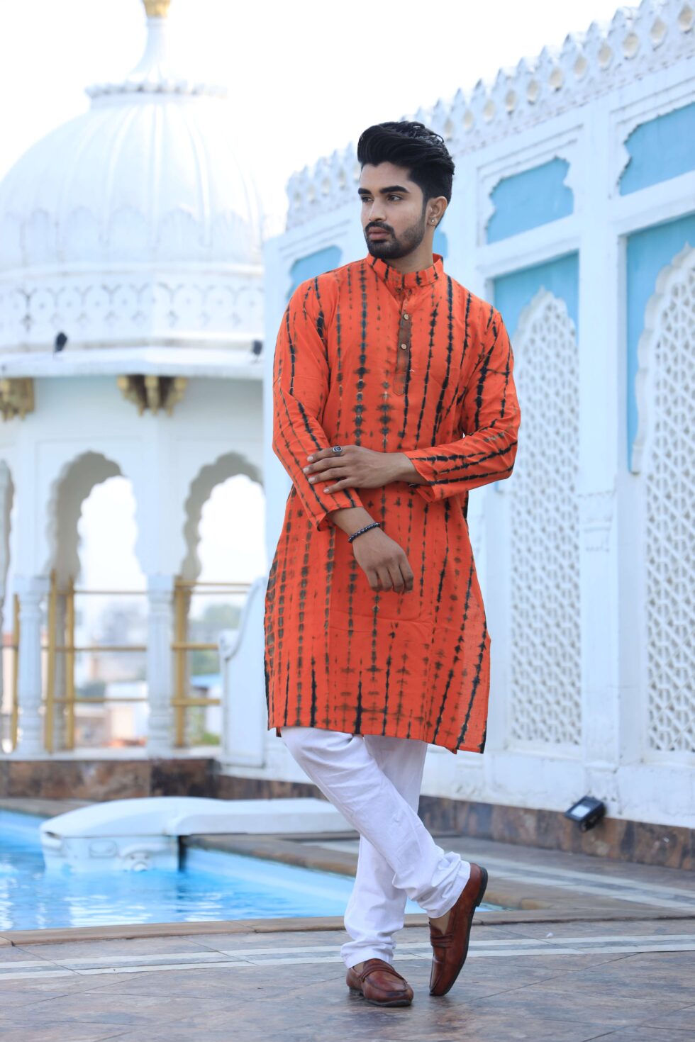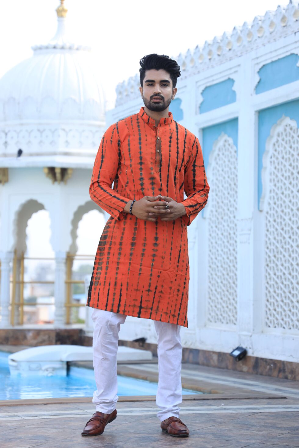 stylish Orange Tie-Dye printed cotton kurta set for men, paired with classic white pajama pants. Designed with a comfortable fit and elegant detailing, this kurta is perfect for festivals, weddings, parties, pooja ceremonies, and cultural celebrations. The breathable cotton fabric ensures comfort, while the subtle printed motifs add a touch of sophistication. Pair it with leather sandals or juttis to complete your traditional look.