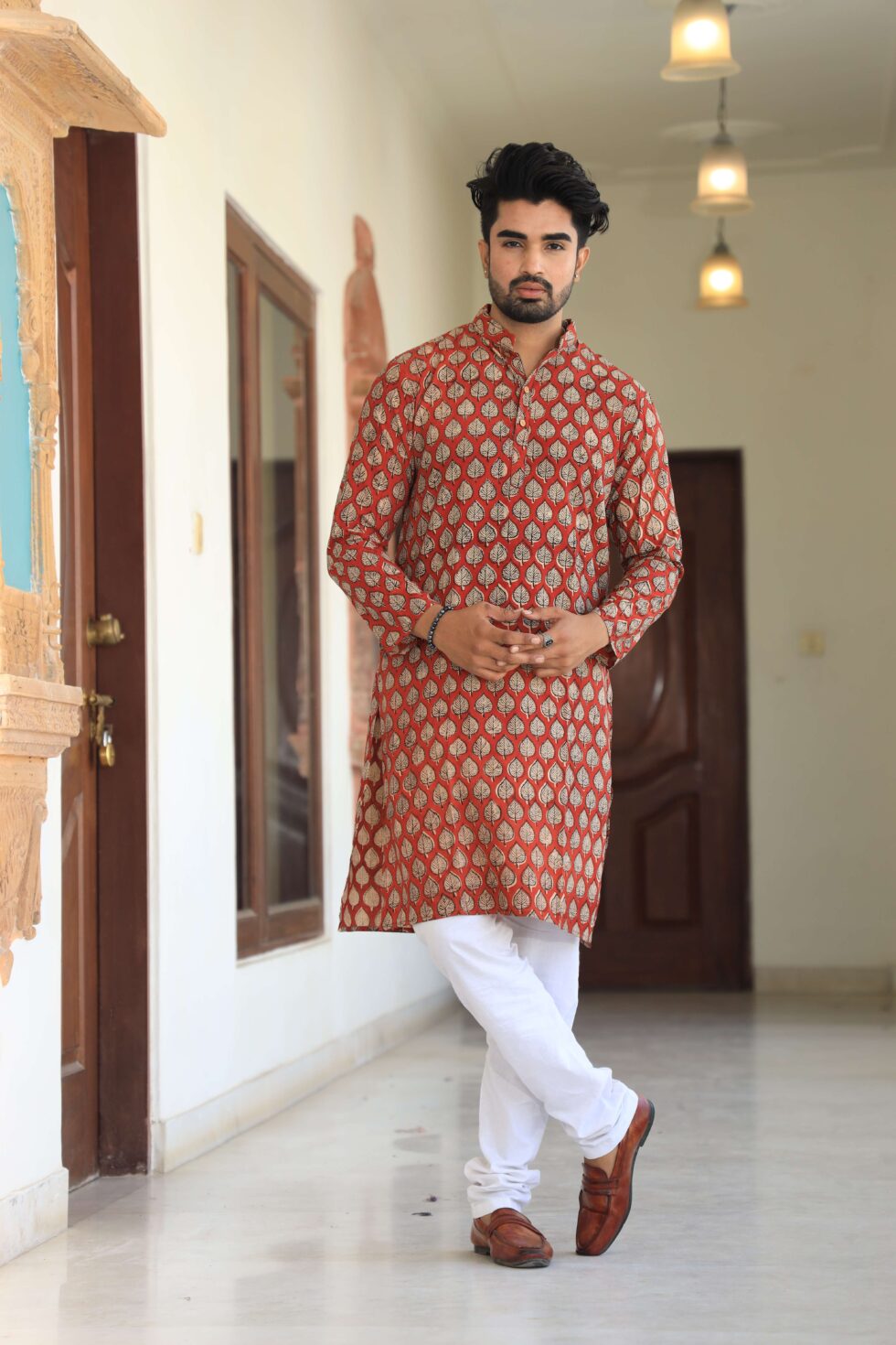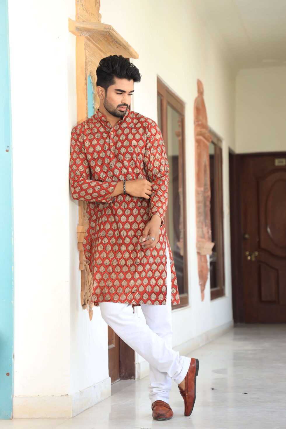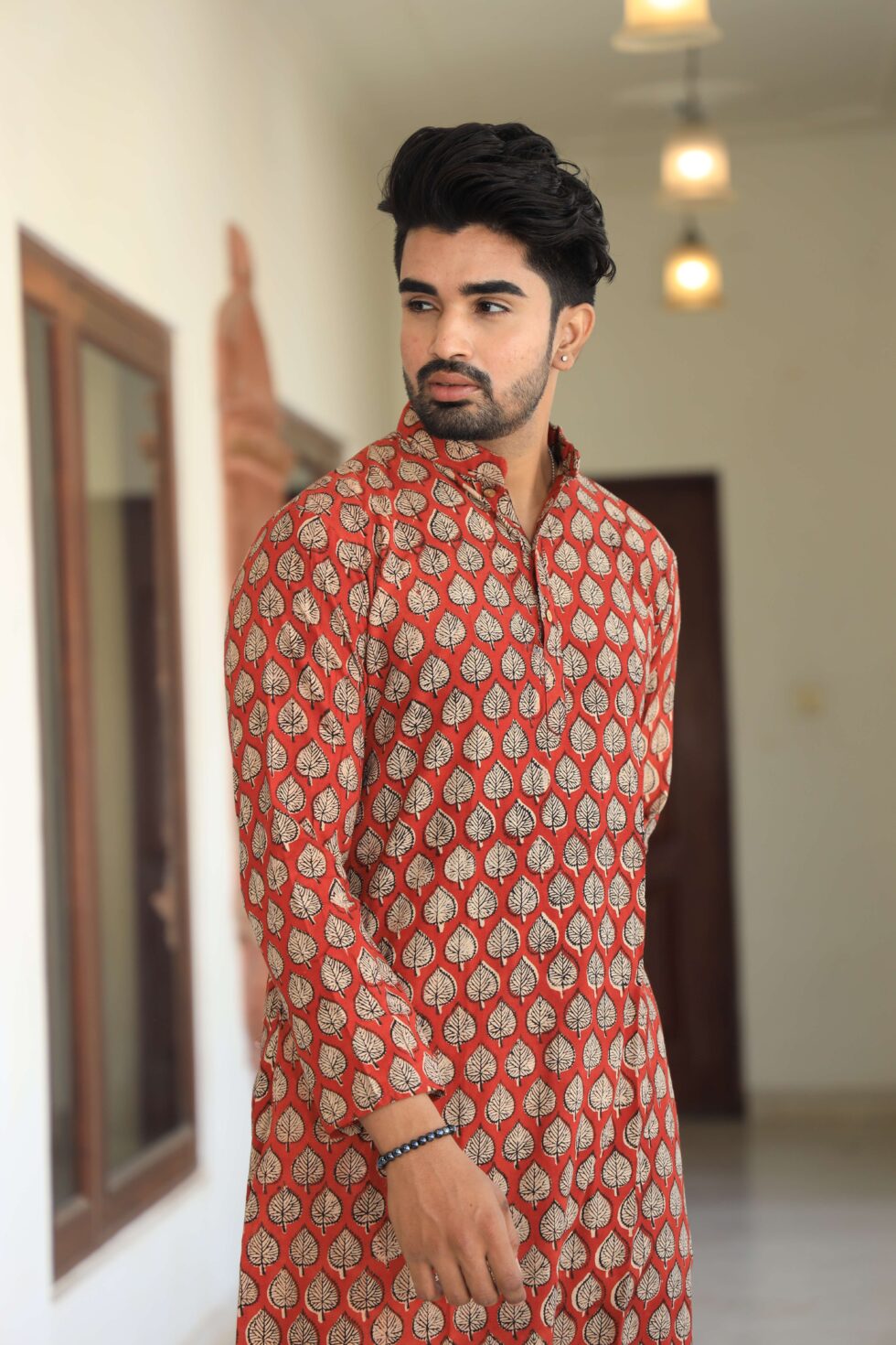 stylish Red Floral printed cotton kurta set for men, paired Red Floral with classic white pajama pants. Designed with a comfortable fit and elegant detailing, this kurta is perfect for festivals, weddings, parties, pooja ceremonies, and cultural celebrations. The breathable cotton fabric ensures comfort, while the subtle printed motifs add a touch of sophistication. Pair it with leather sandals or juttis to complete your traditional look.