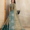 Modern Abstract Printed Linen Saree in Grey and Teal with Geometric and Artistic Patterns