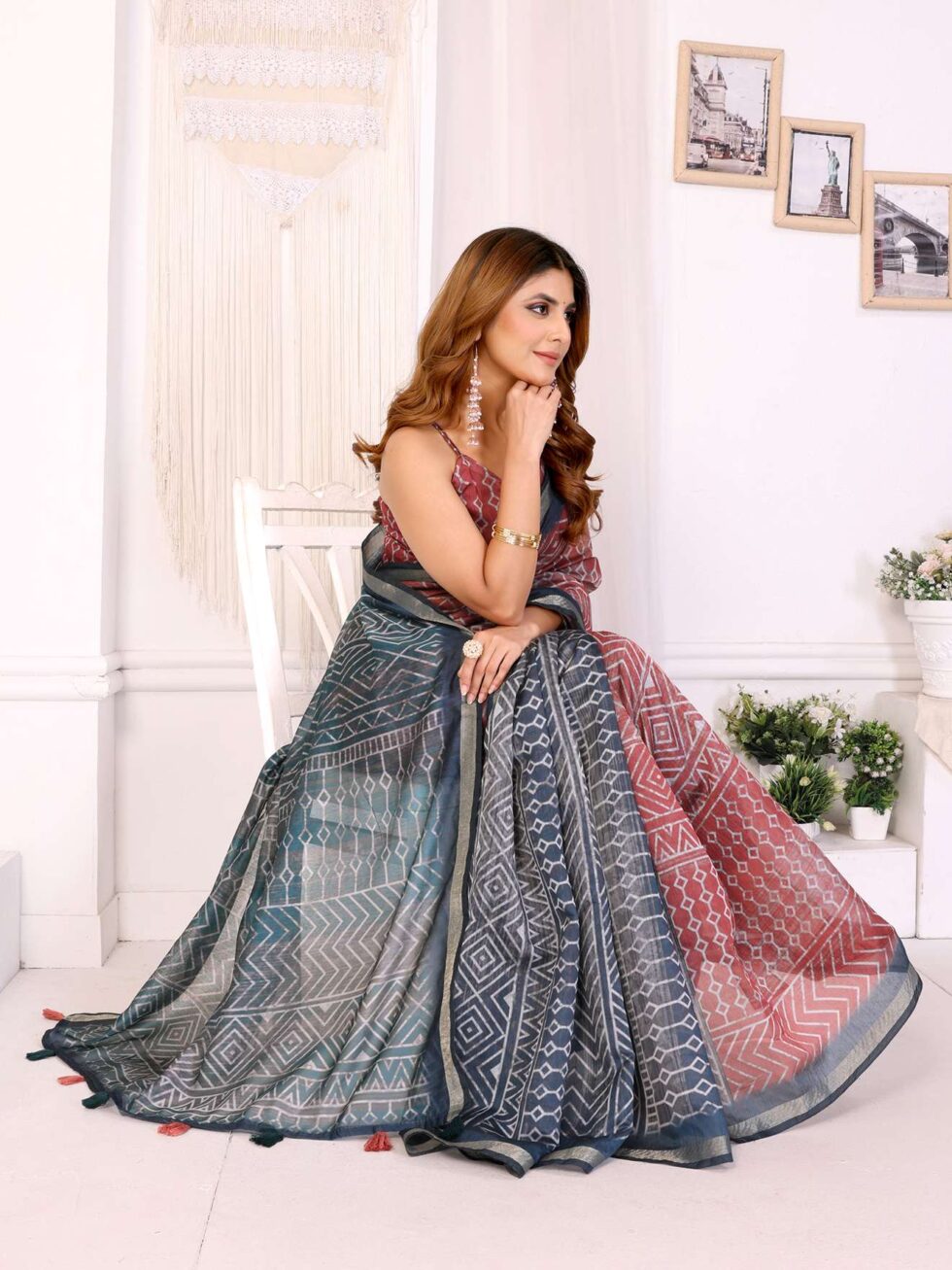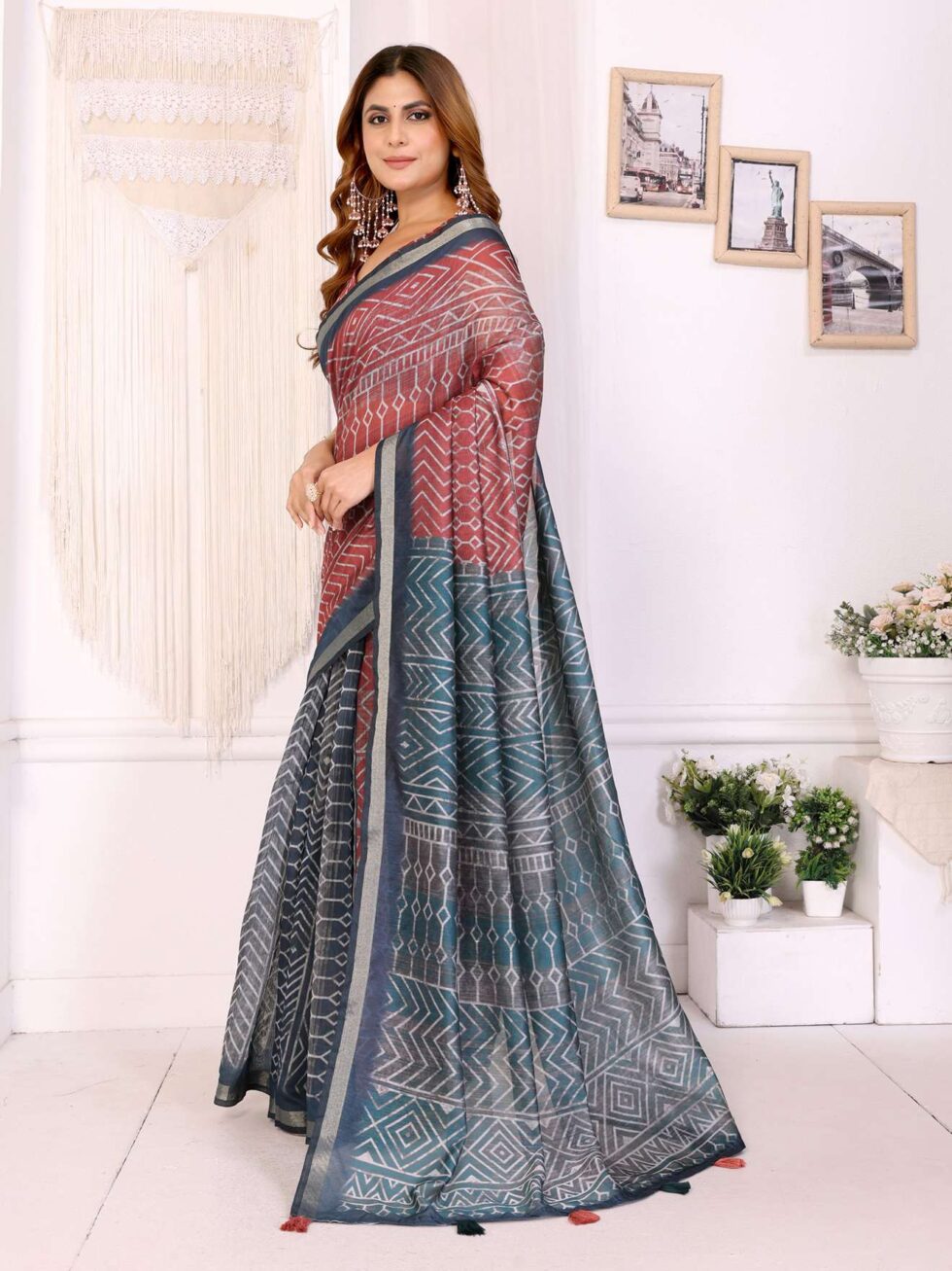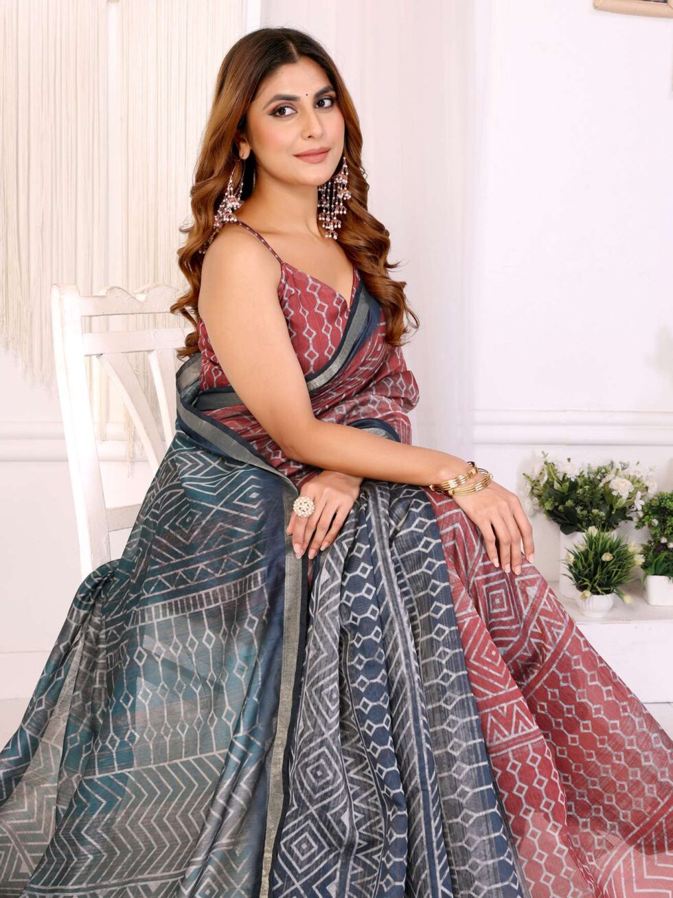Stylish Chanderi saree in rust red, teal blue, and grey with bold geometric prints. Lightweight, elegant, and perfect for festive, traditional, or casual gatherings.