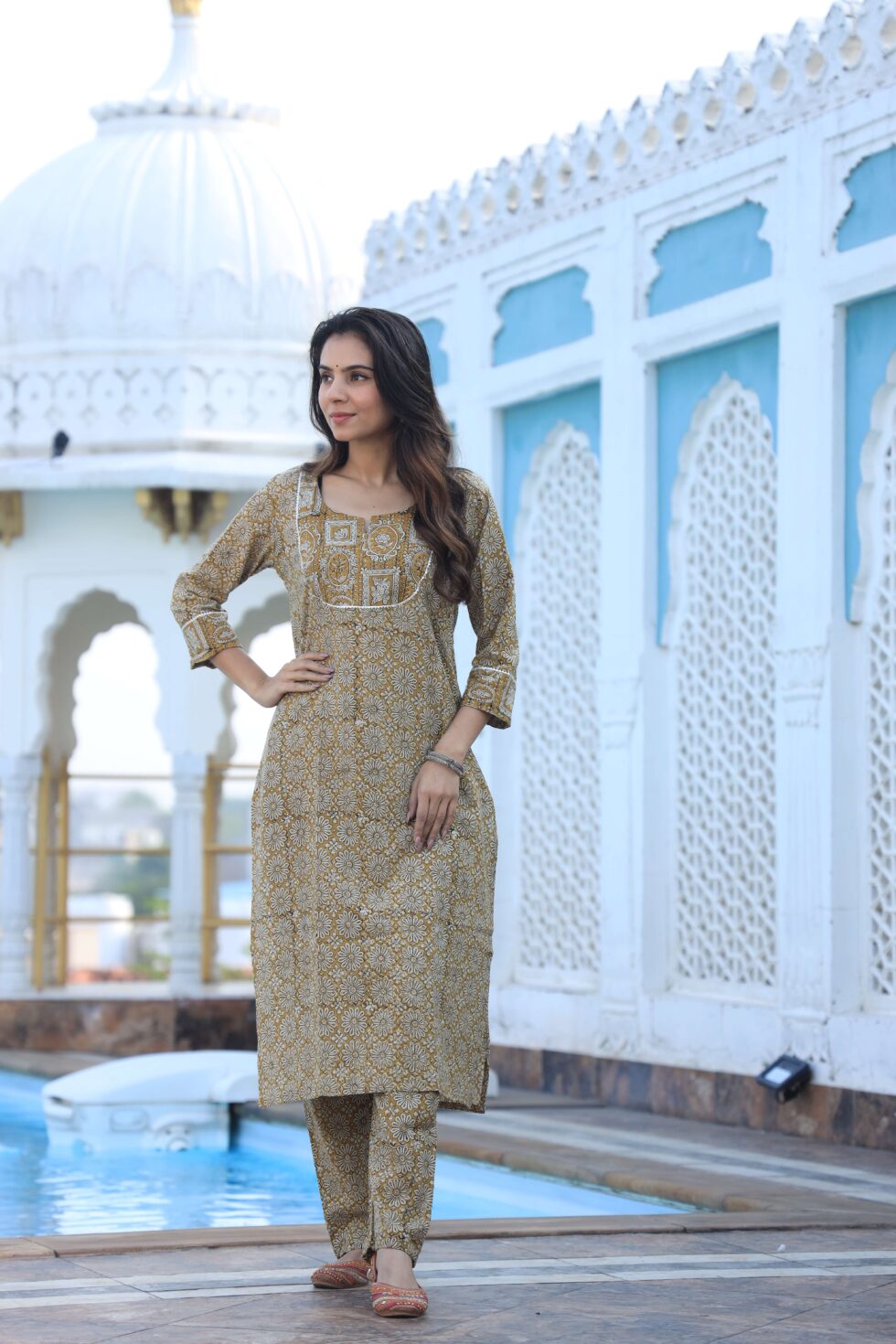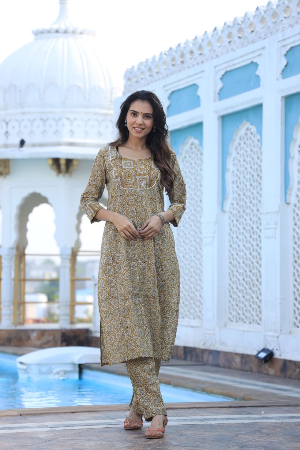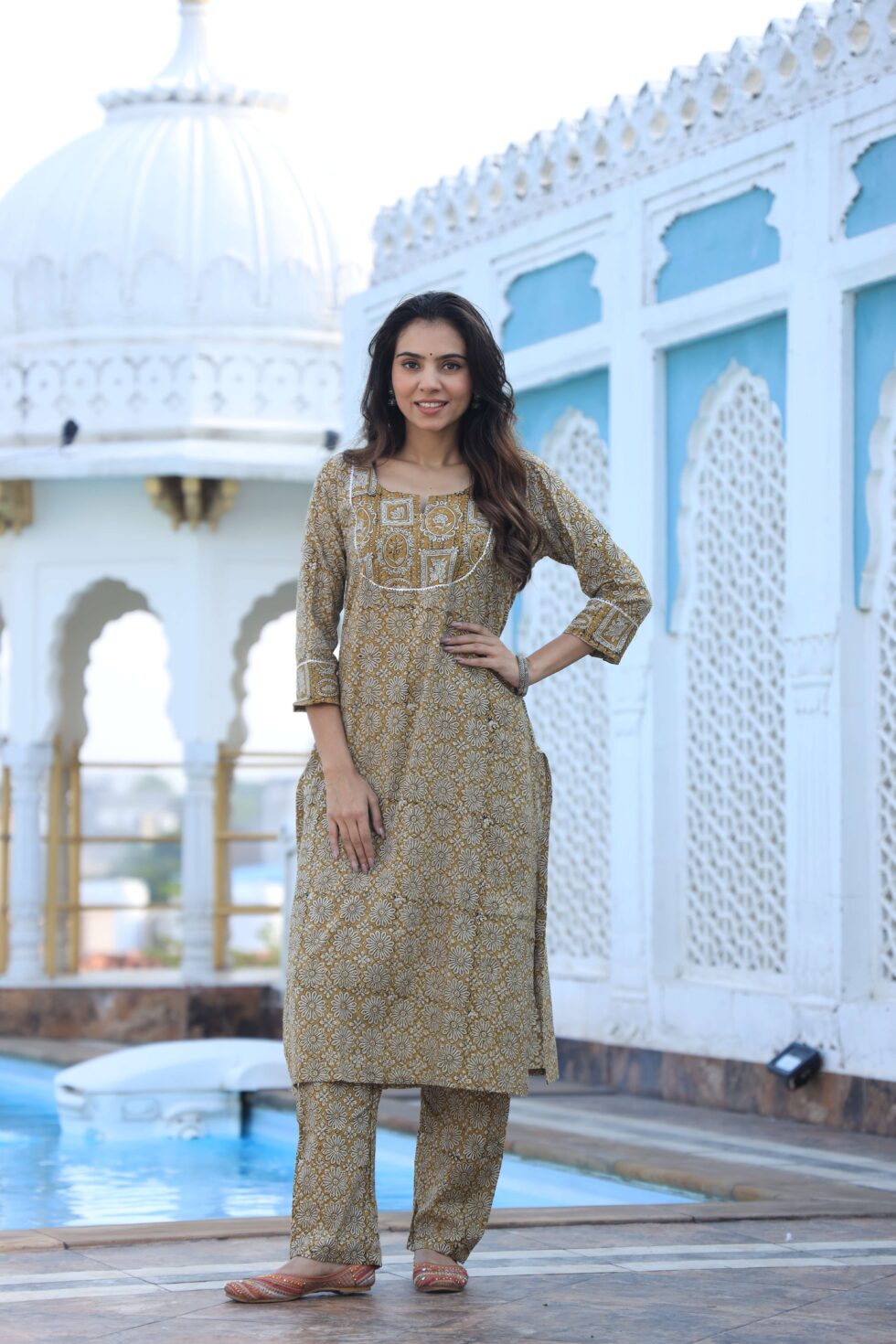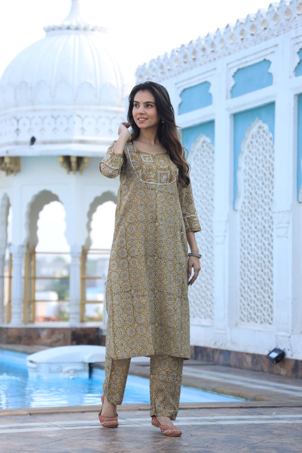 Teal printed cotton kurta set, crafted for women who love a balance of tradition and modern style. The kurta features all-over white handblock-inspired circular motifs, paired with a contrast striped yoke design that adds a chic touch to the outfit. Designed with a straight fit and 3/4th sleeves, this set offers effortless comfort and sophistication. The breathable cotton fabric makes it perfect for daily wear, office dressing, festive events, and semi-formal gatherings. It comes with matching printed pants, ensuring a complete coordinated look.