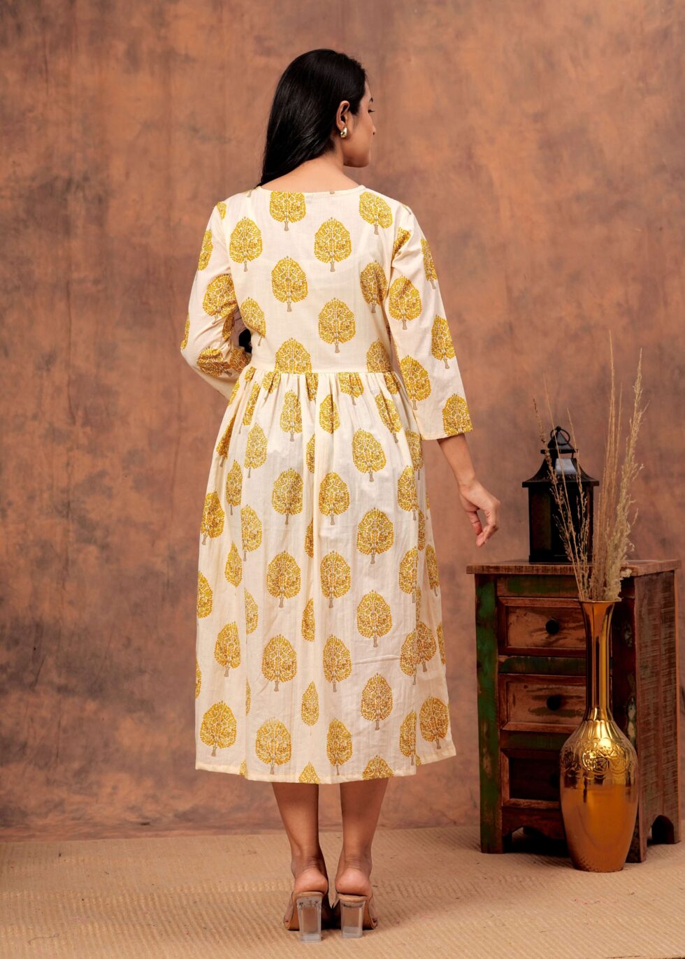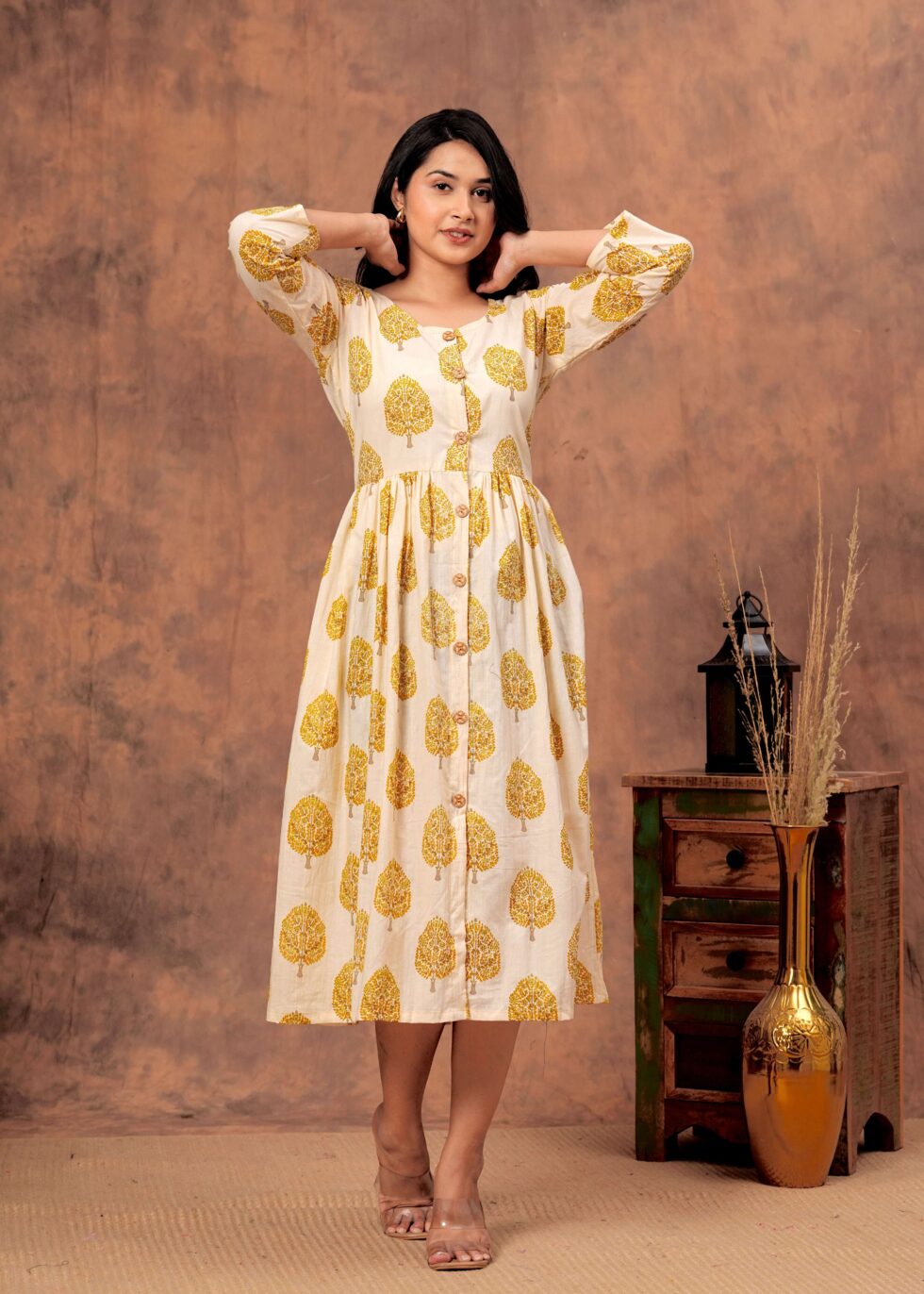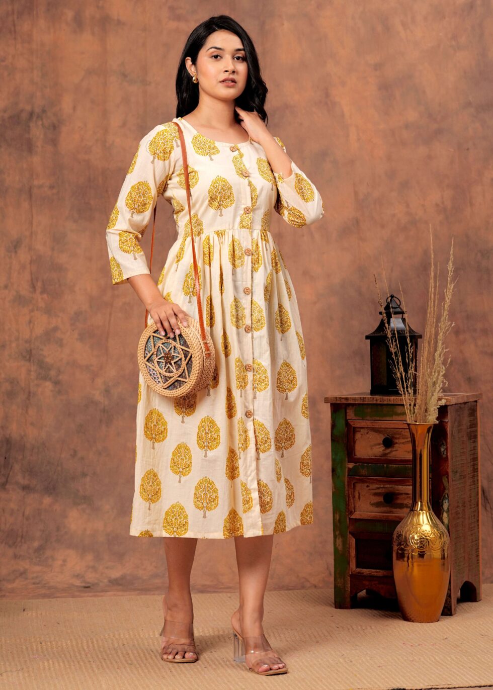 The 3/4th sleeves bring a chic balance of coverage and style, while the midi length ensures a graceful, sophisticated look. Whether you?re heading to brunch, a casual meet-up, or a special celebration, this versatile dress seamlessly transitions from casual wear to party wear with just the right accessories.