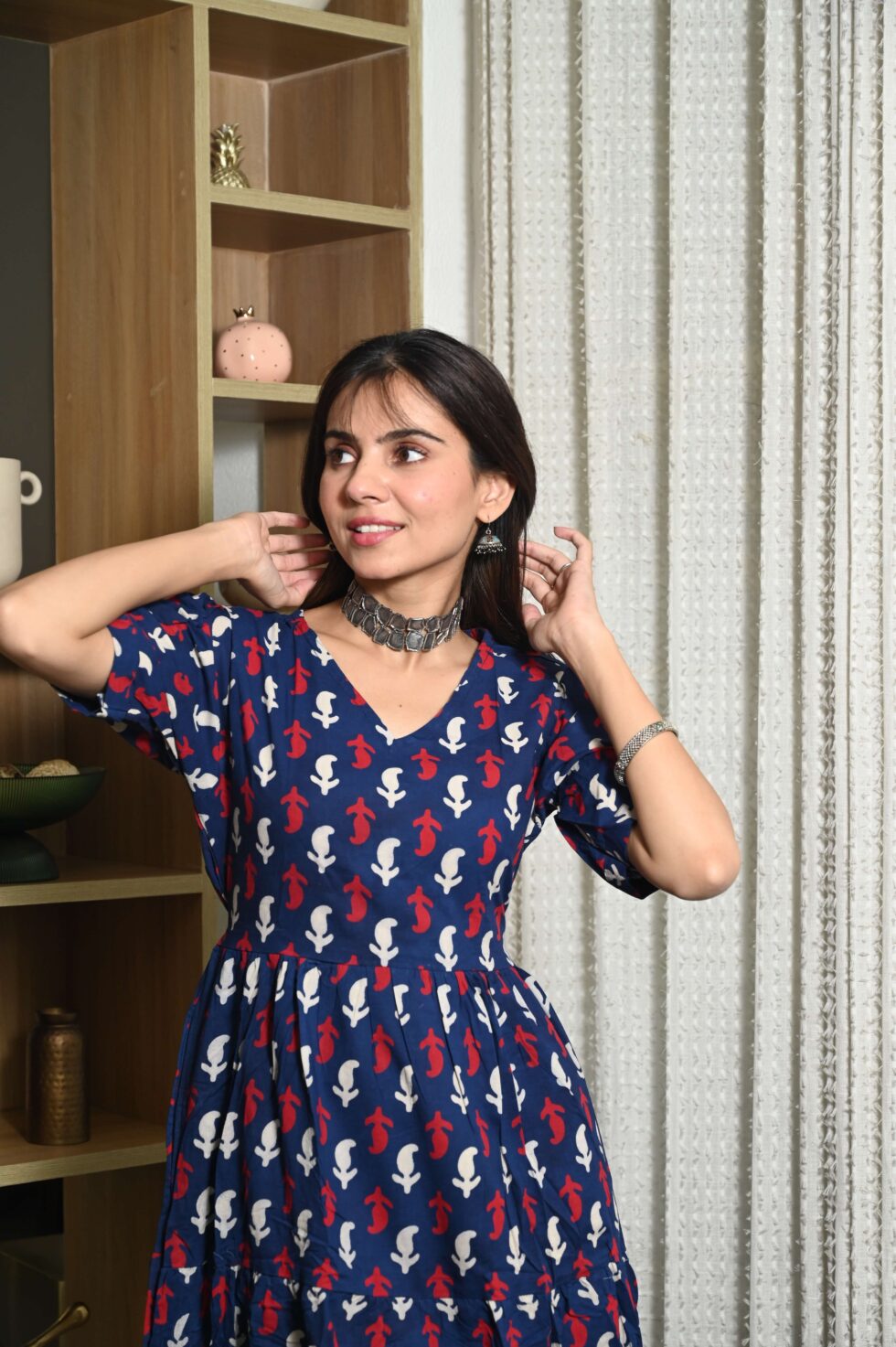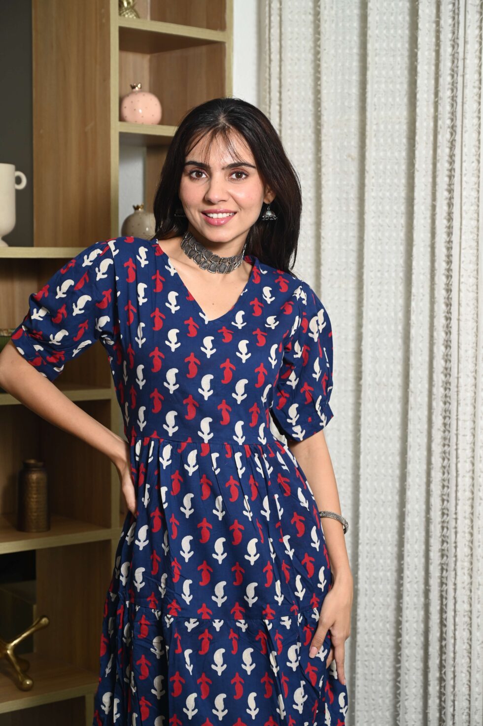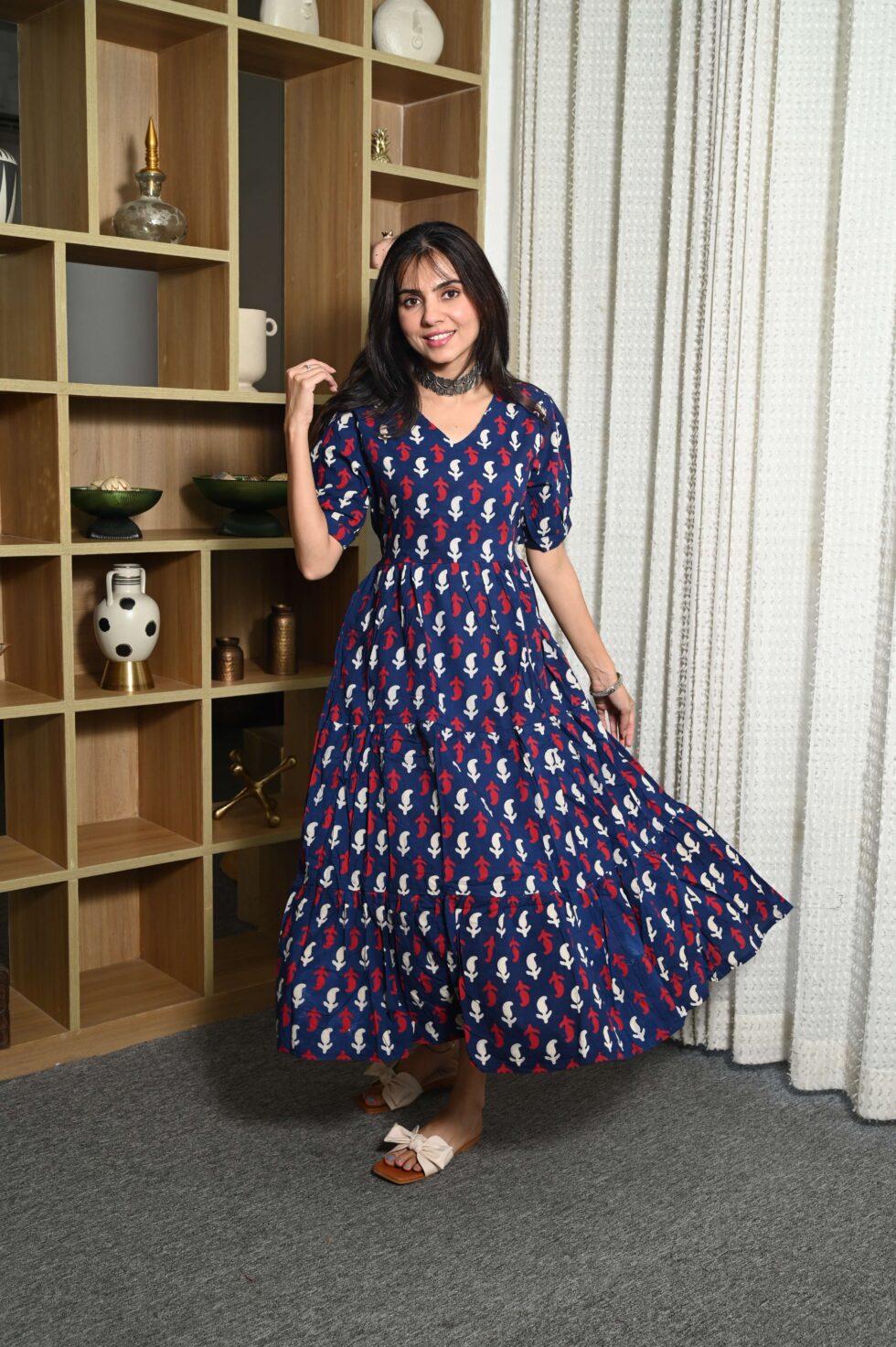 ffortless elegance with this navy blue cotton anarkali maxi dress featuring a vibrant floral print, puff sleeves, and a flattering fit-and-flare design. Perfect for casual outings, brunches, and vacation styling.