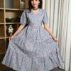 Elevate your everyday look with this Navy Blue Floral Printed Cotton Anarkali Maxi Dress, designed to blend comfort with chic style. Crafted from breathable cotton fabric, this dress features a beautiful all-over floral pattern that adds a touch of charm and femininity. The V-neckline and puff sleeves give it a trendy silhouette, while the flared tiered hemline ensures graceful movement with every step.