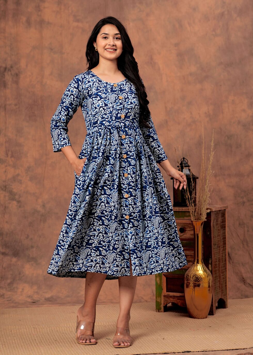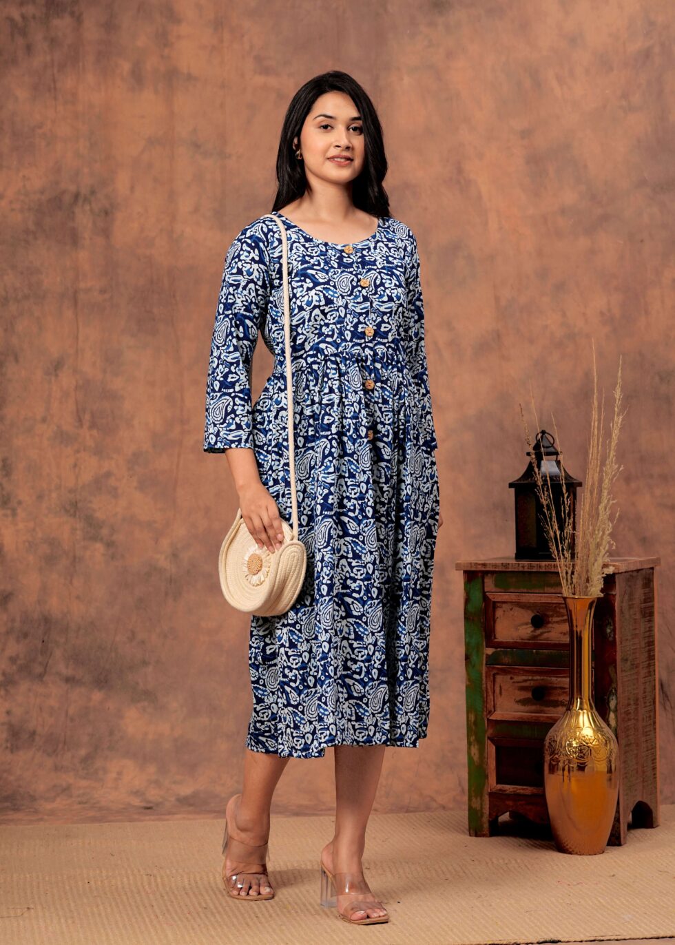 The 3/4th sleeves bring a chic balance of coverage and style, while the midi length ensures a graceful, sophisticated look. Whether you?re heading to brunch, a casual meet-up, or a special celebration, this versatile dress seamlessly transitions from casual wear to party wear with just the right accessories.