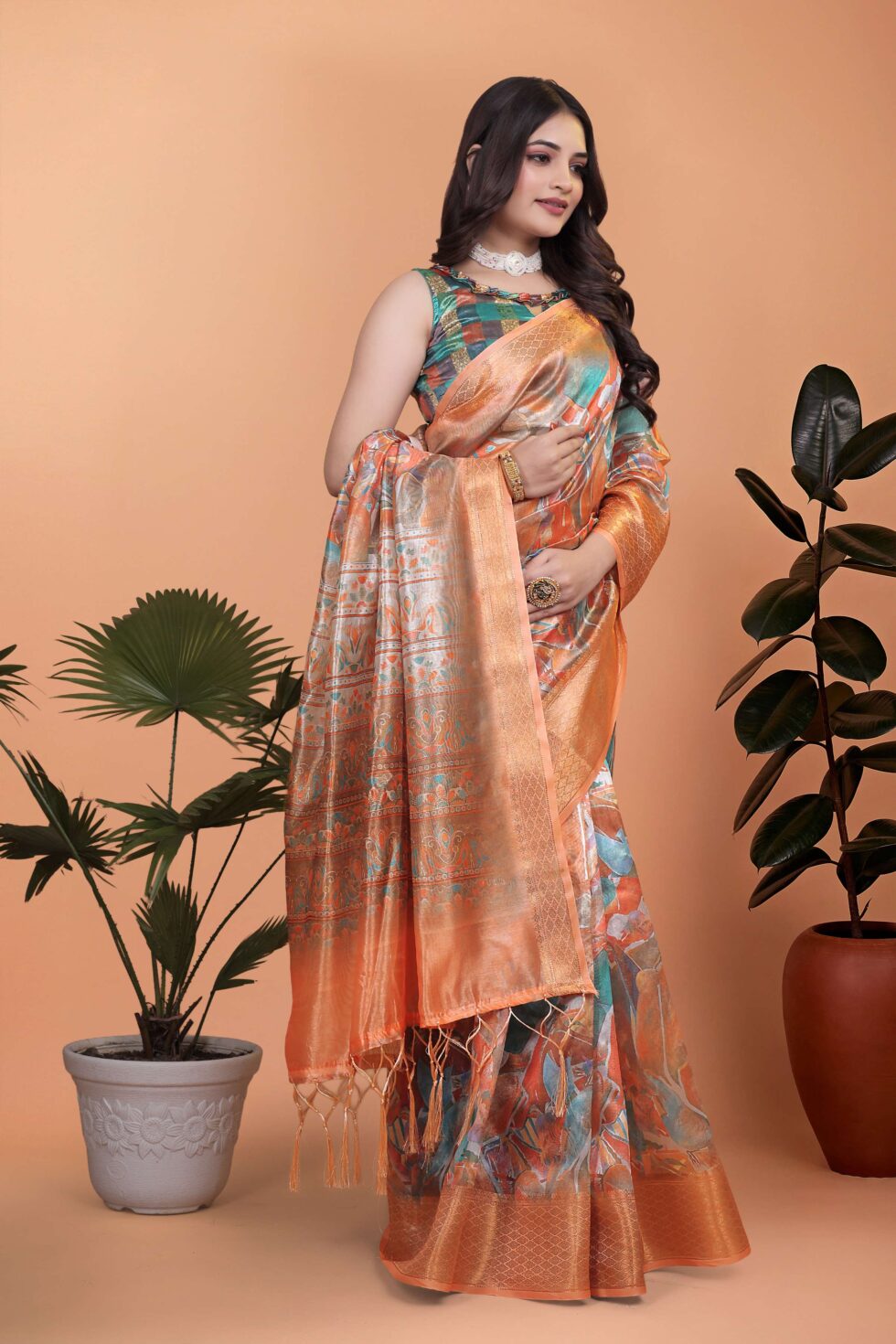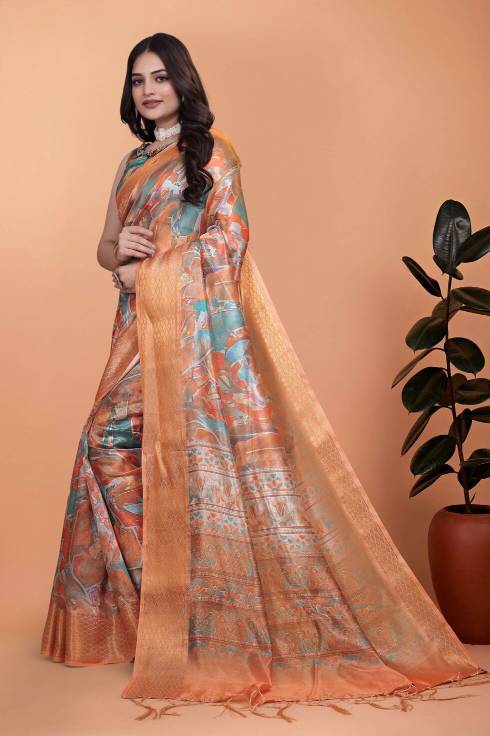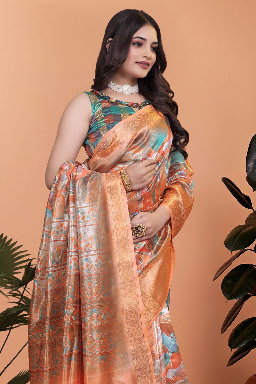 Enhance your ethnic collection with this graceful orange soft silk blend saree, beautifully complemented by a copper and green printed pallu. The body features subtle digital print work, while the borders are adorned with elegant gold zari weaving, adding a touch of sophistication and charm.
