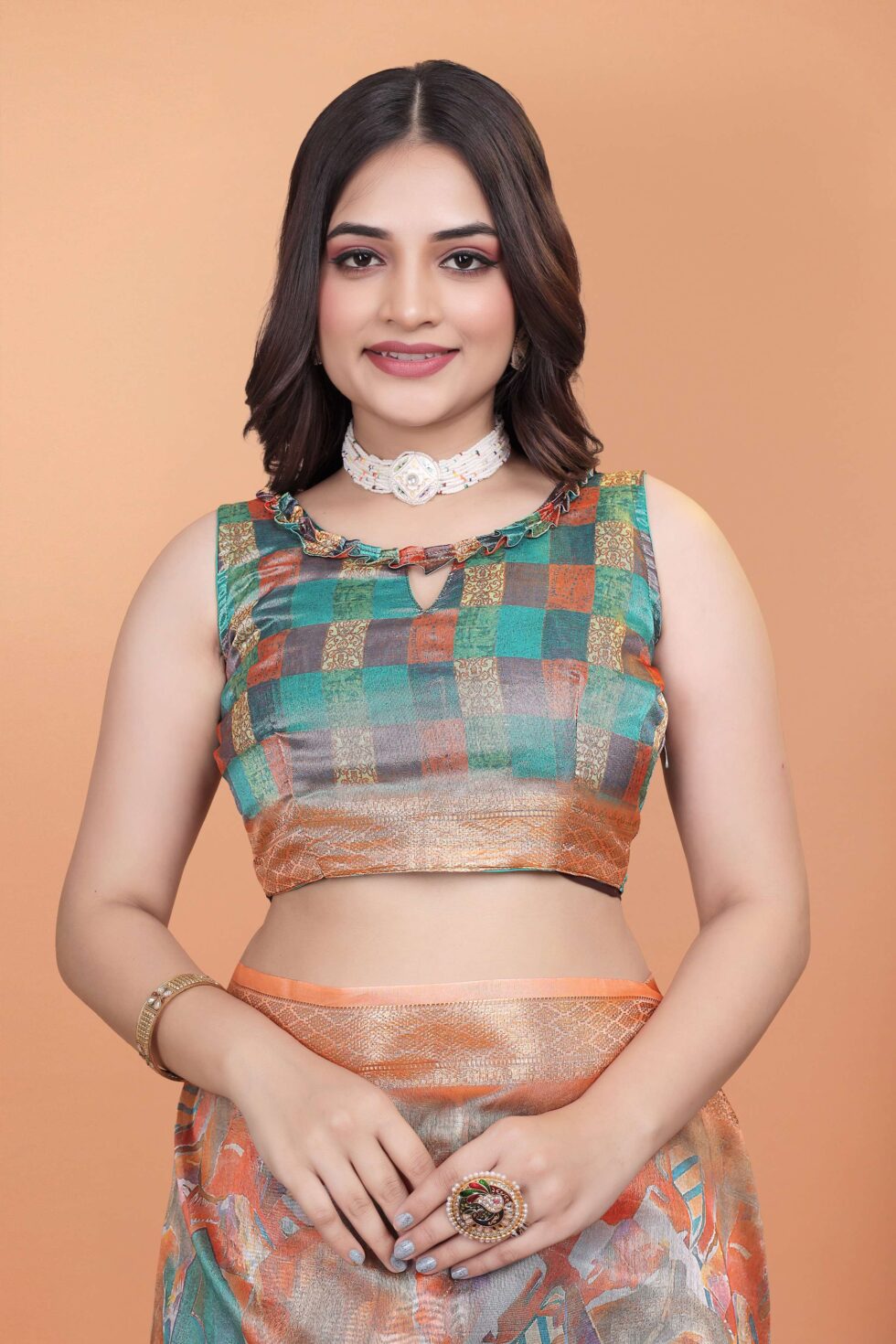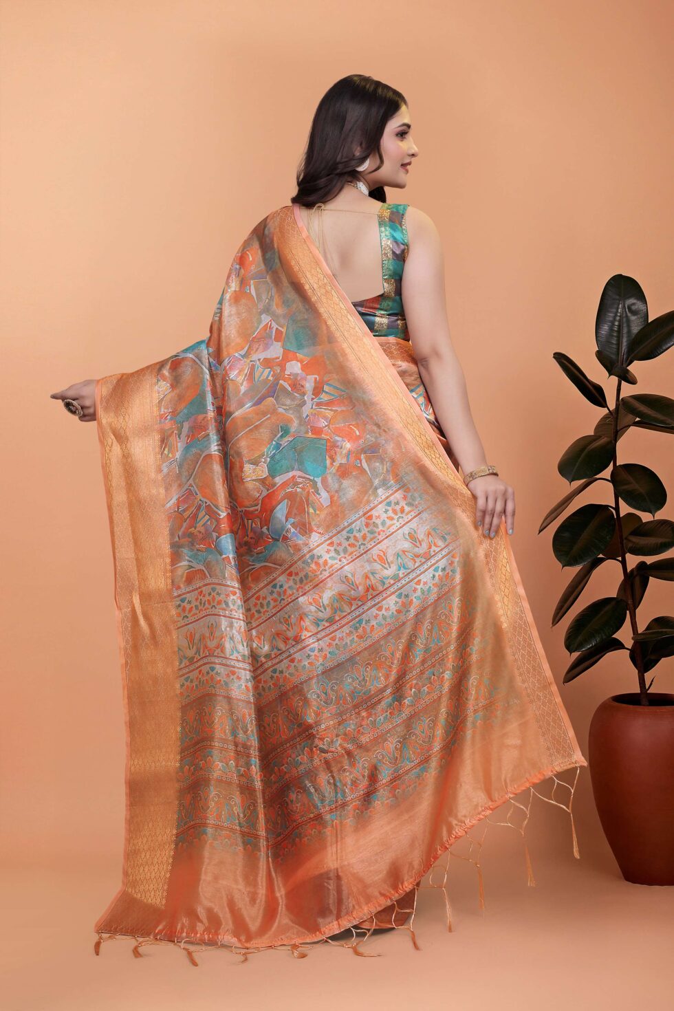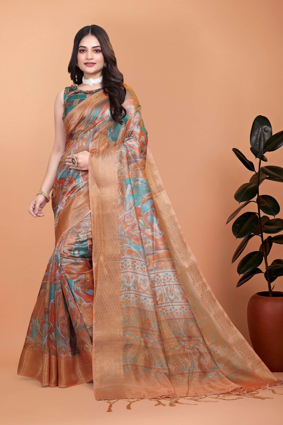 Enhance your ethnic collection with this graceful orange soft silk blend saree, beautifully complemented by a copper and green printed pallu. The body features subtle digital print work, while the borders are adorned with elegant gold zari weaving, adding a touch of sophistication and charm.