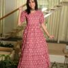 Peach Printed Cotton Anarkali Maxi Dress with Puff Sleeves ? Elegant Casual Wear