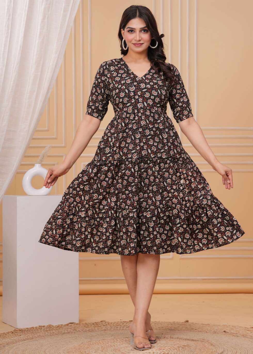 Effortless elegance with our Floral Printed A-Line Midi Dress, designed to keep you stylish and comfortable all day long. Crafted from premium breathable fabric, this dress features a timeless A-line silhouette that flatters every body type. The vibrant floral print on a classic black base adds a touch of charm, making it perfect for both daytime outings and evening gatherings.