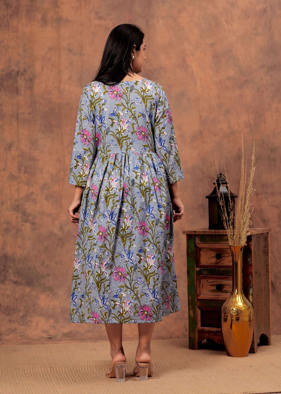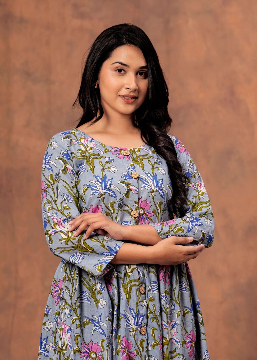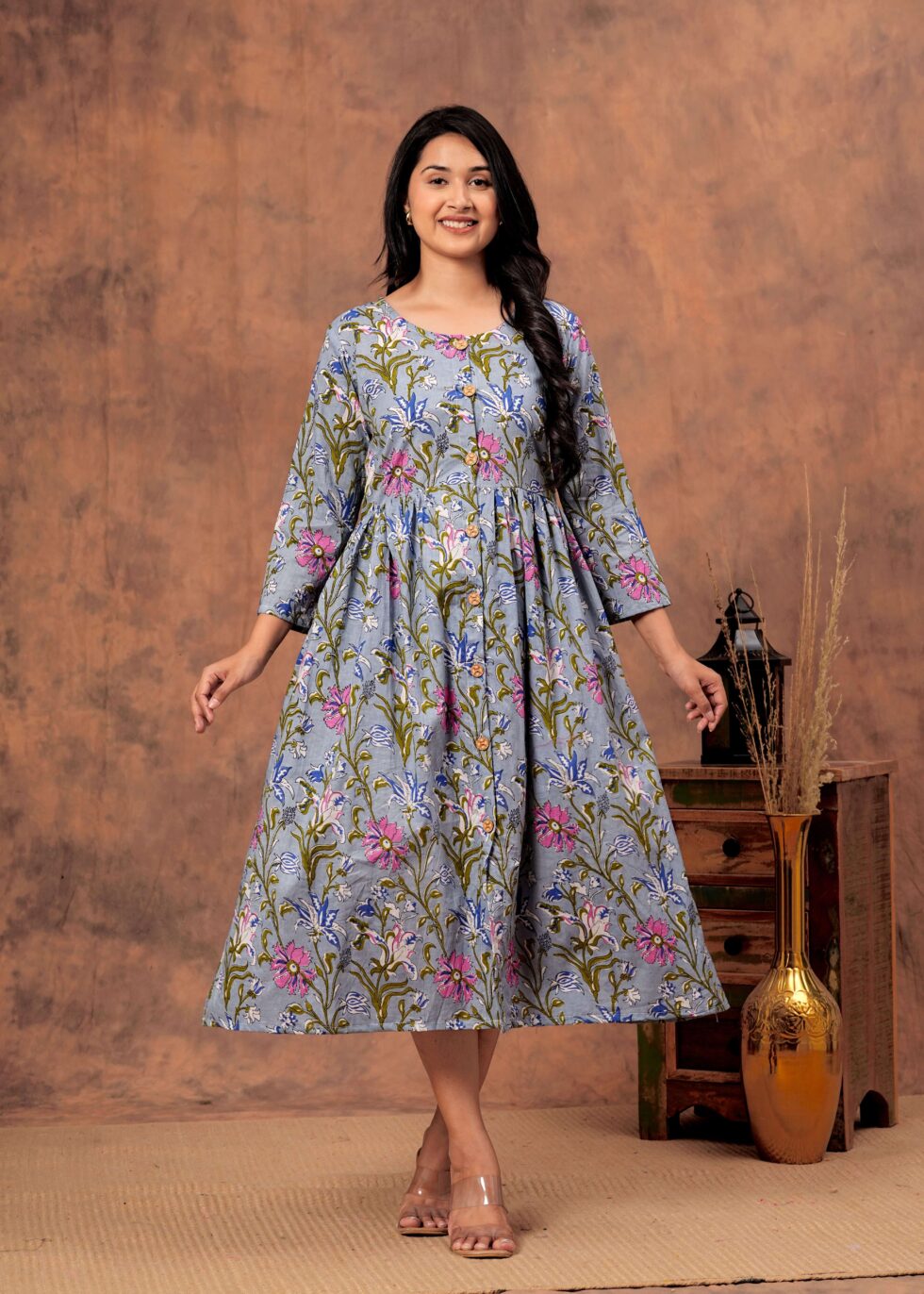 Elevate your style with this Floral Printed A-Line Midi Dress featuring chic 3/4th sleeves and a flattering silhouette. Perfect for casual outings, office wear, or party nights, this versatile dress blends comfort with timeless elegance.