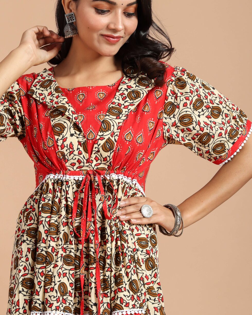 Red & Beige Printed Tiered Maxi Dress with Short Sleeves & Waist Tie ? Ethnic Boho Fusion Wear