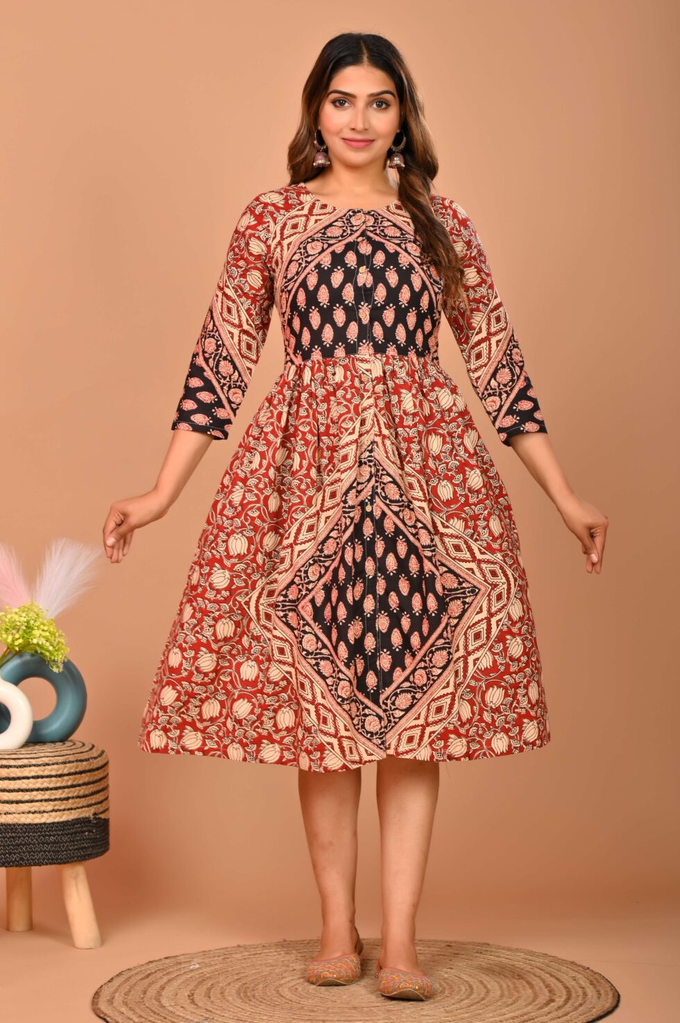 Red & Black Ethnic Block Printed A-Line Midi Dress with 3/4 Sleeves ? Festive & Casual Wear
