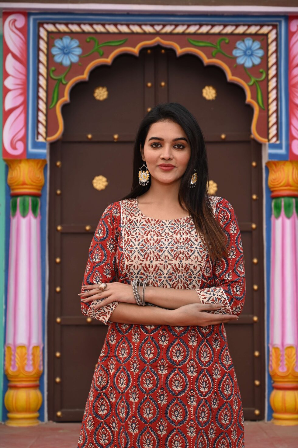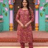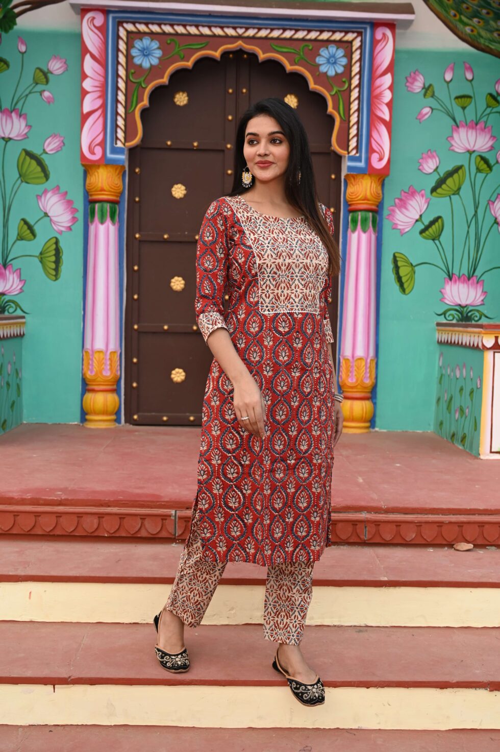 Stylish red cotton kurta with cream patchwork and all-over block prints, paired with matching cream printed straight pants. Perfect for festive, office, and casual wear.