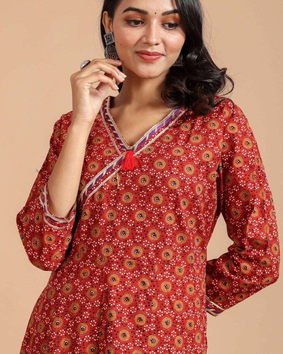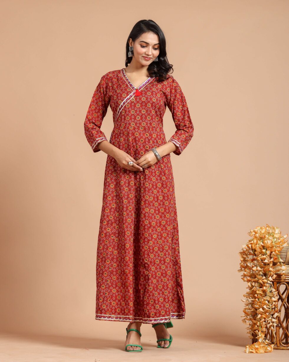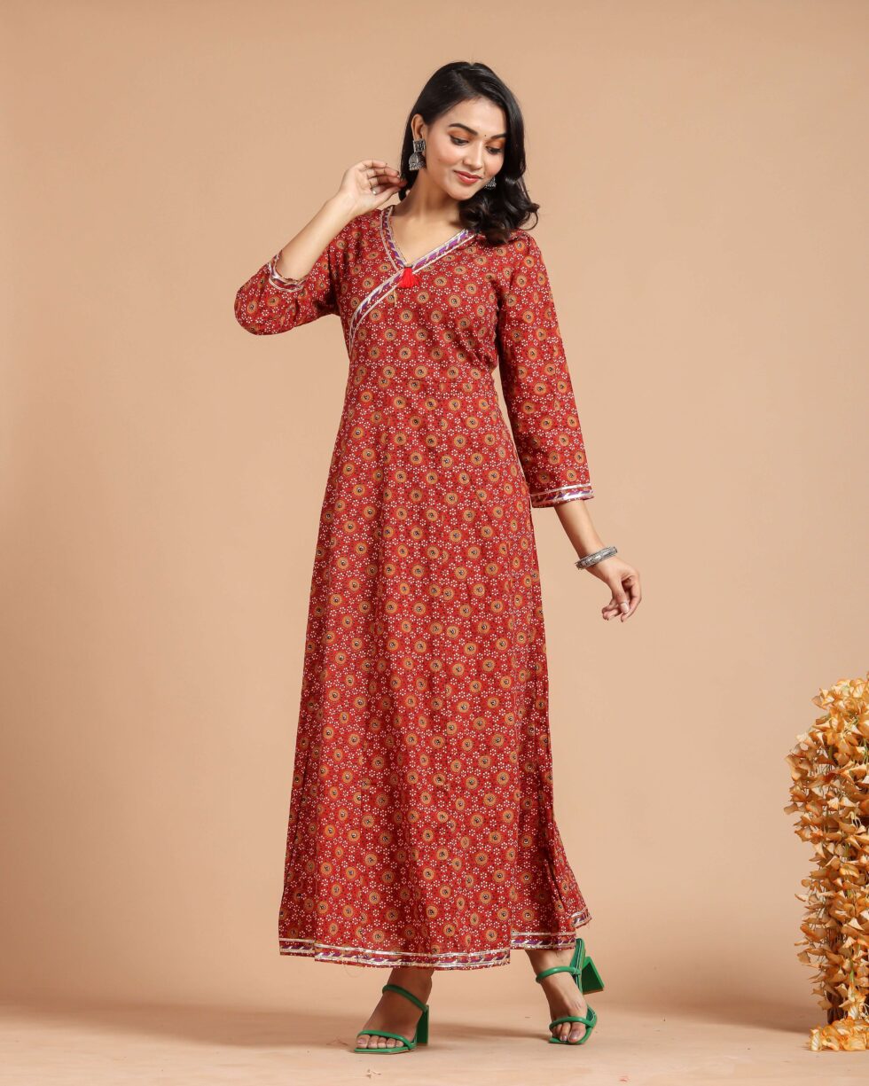 Red Printed Anarkali Maxi Dress with V-Neck & 3/4 Sleeves ? Festive Ethnic Long Dress