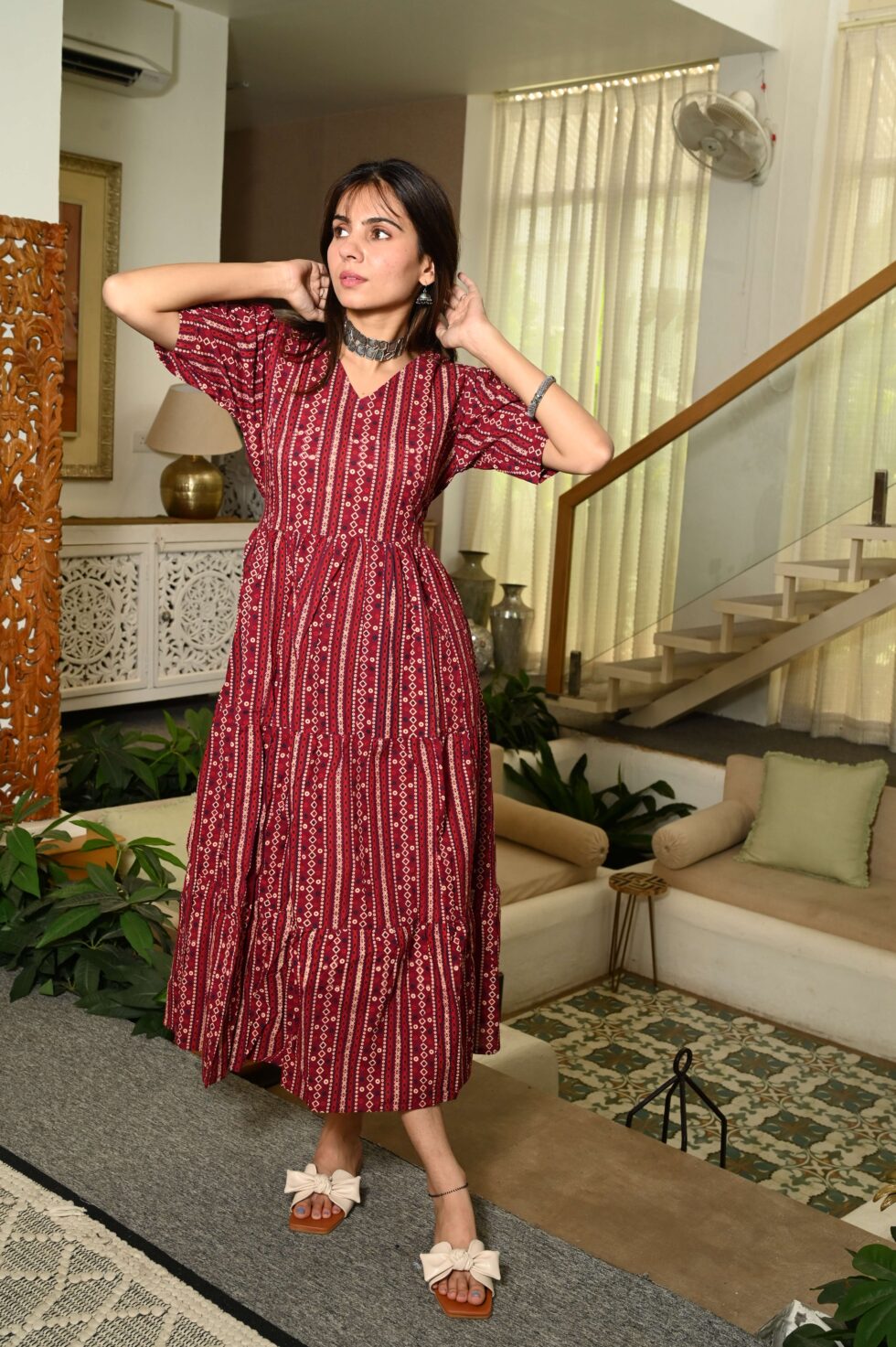 ffortless elegance with this Red cotton anarkali maxi dress featuring a vibrant floral print, puff sleeves, and a flattering fit-and-flare design. Perfect for casual outings, brunches, and vacation styling.