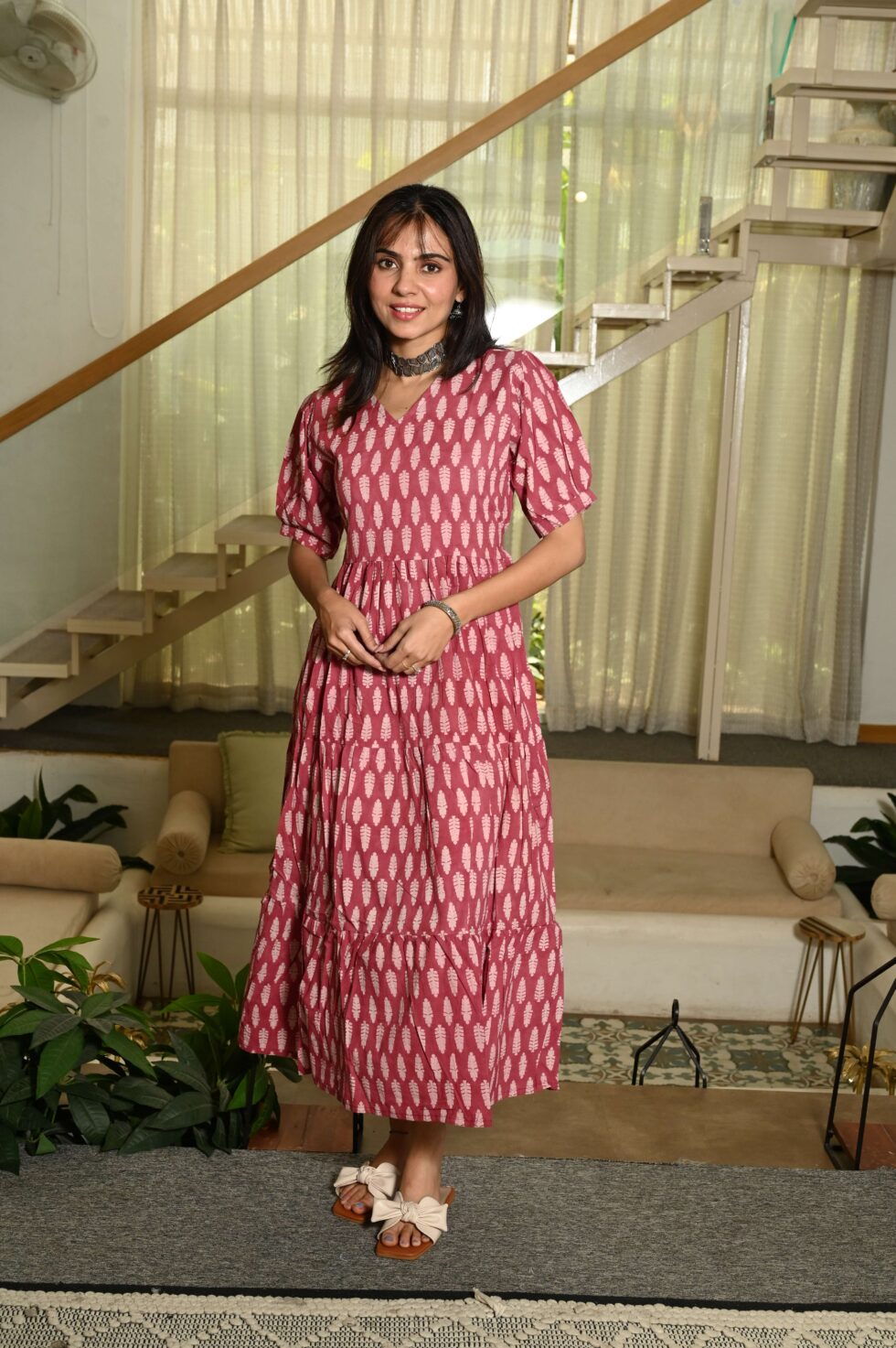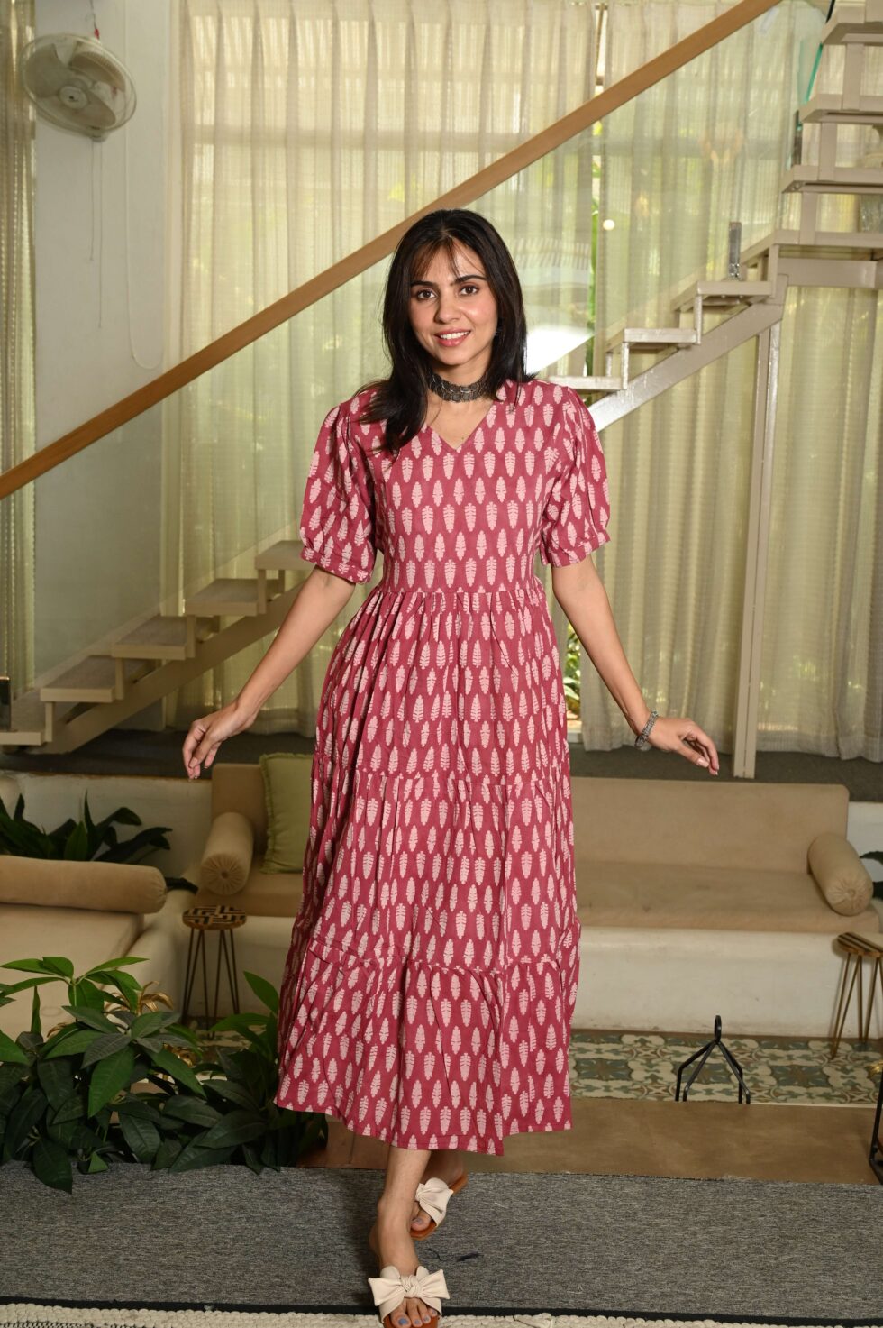 ffortless elegance with this Red cotton anarkali maxi dress featuring a vibrant floral print, puff sleeves, and a flattering fit-and-flare design. Perfect for casual outings, brunches, and vacation styling.