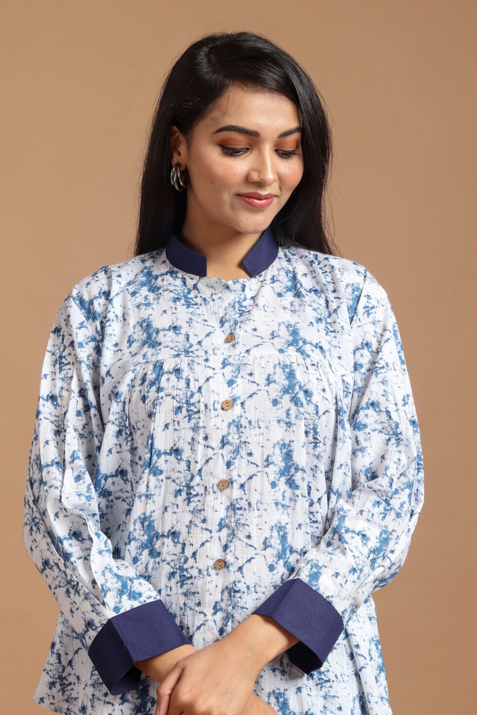 White printed sleeveless top for women, crafted from soft breathable fabric. Featuring a trendy tie-up neckline with tassels, this modern top is perfect for casual wear, office styling, or weekend outings. Its monochrome pattern adds a chic touch, making it easy to pair with jeans, trousers, or skirts for a versatile look.