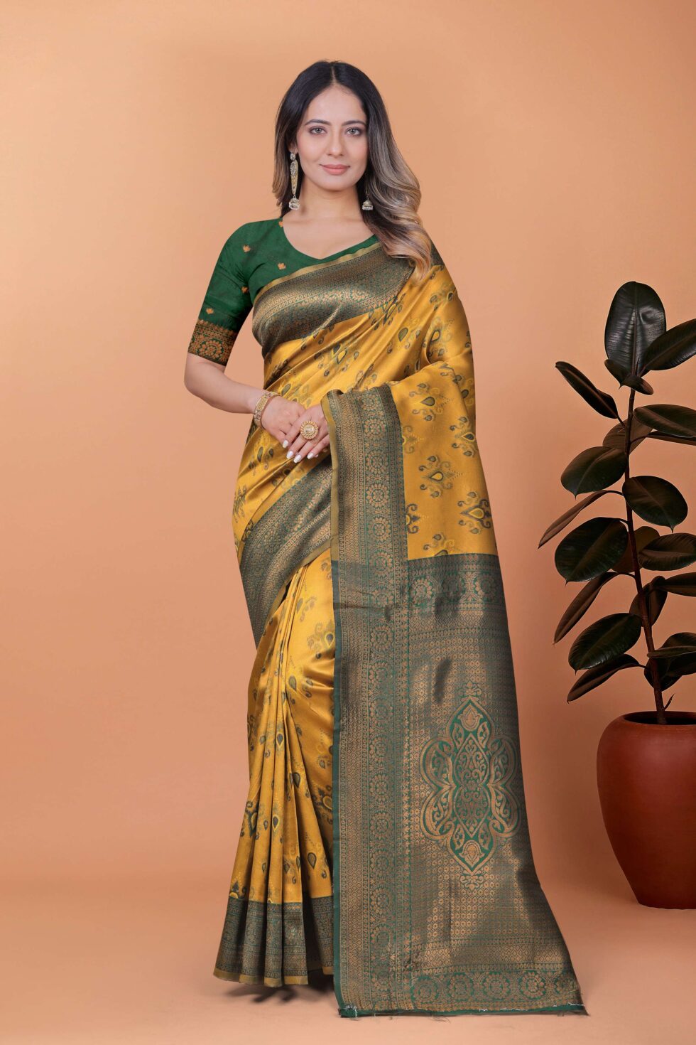 Regal Glow Mustard Yellow & Emerald Green Banarasi Silk Saree with Zari Work | Wedding, Festive & Temple Occasion Wear