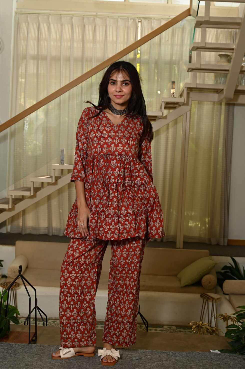 Rust Red Floral Block Print Cotton Co-ord Set for Women ? Peplum Kurta with Straight Pants