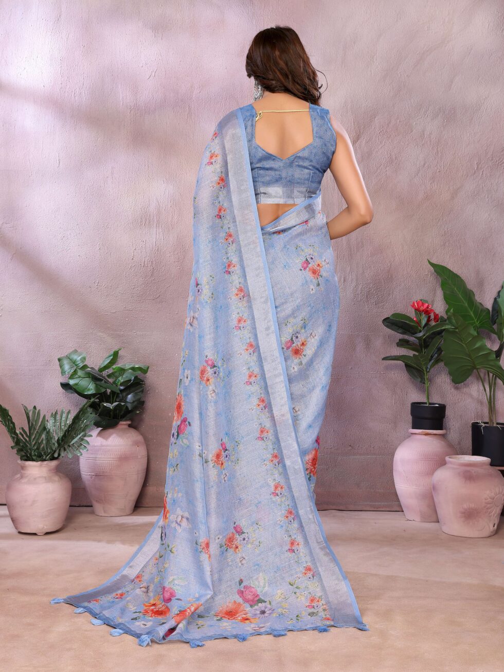 Serene Sky Blue Floral Printed Linen Shimmer Saree with Tassel Accents