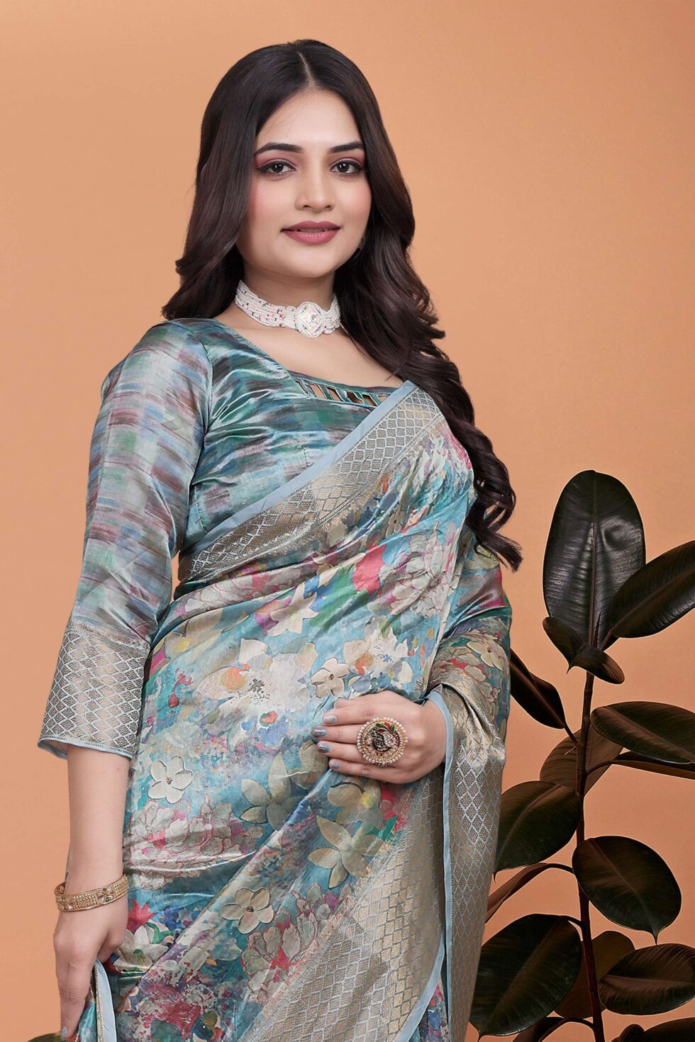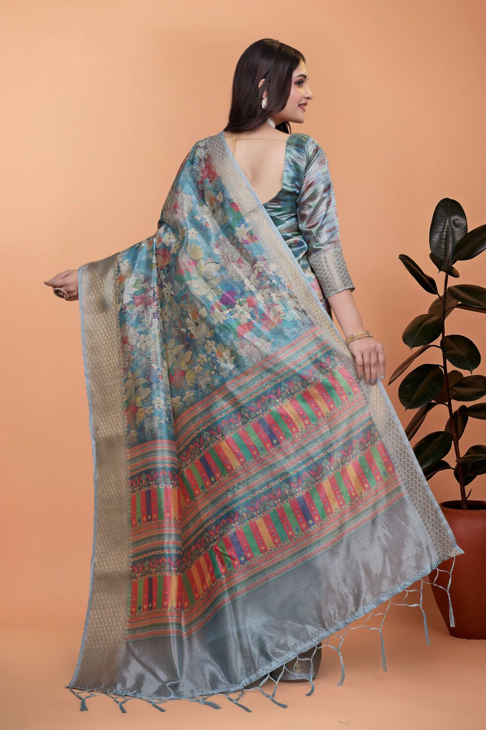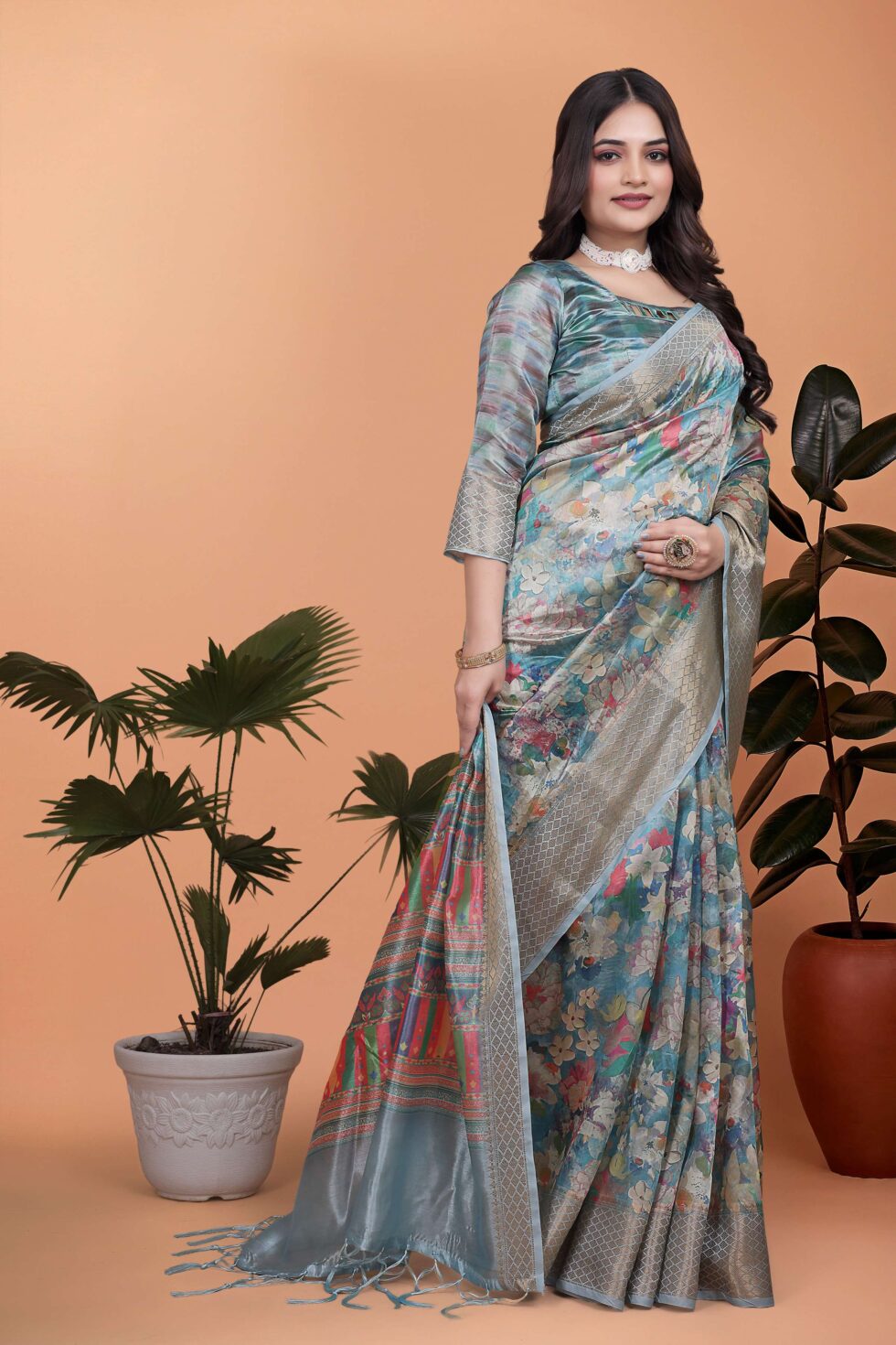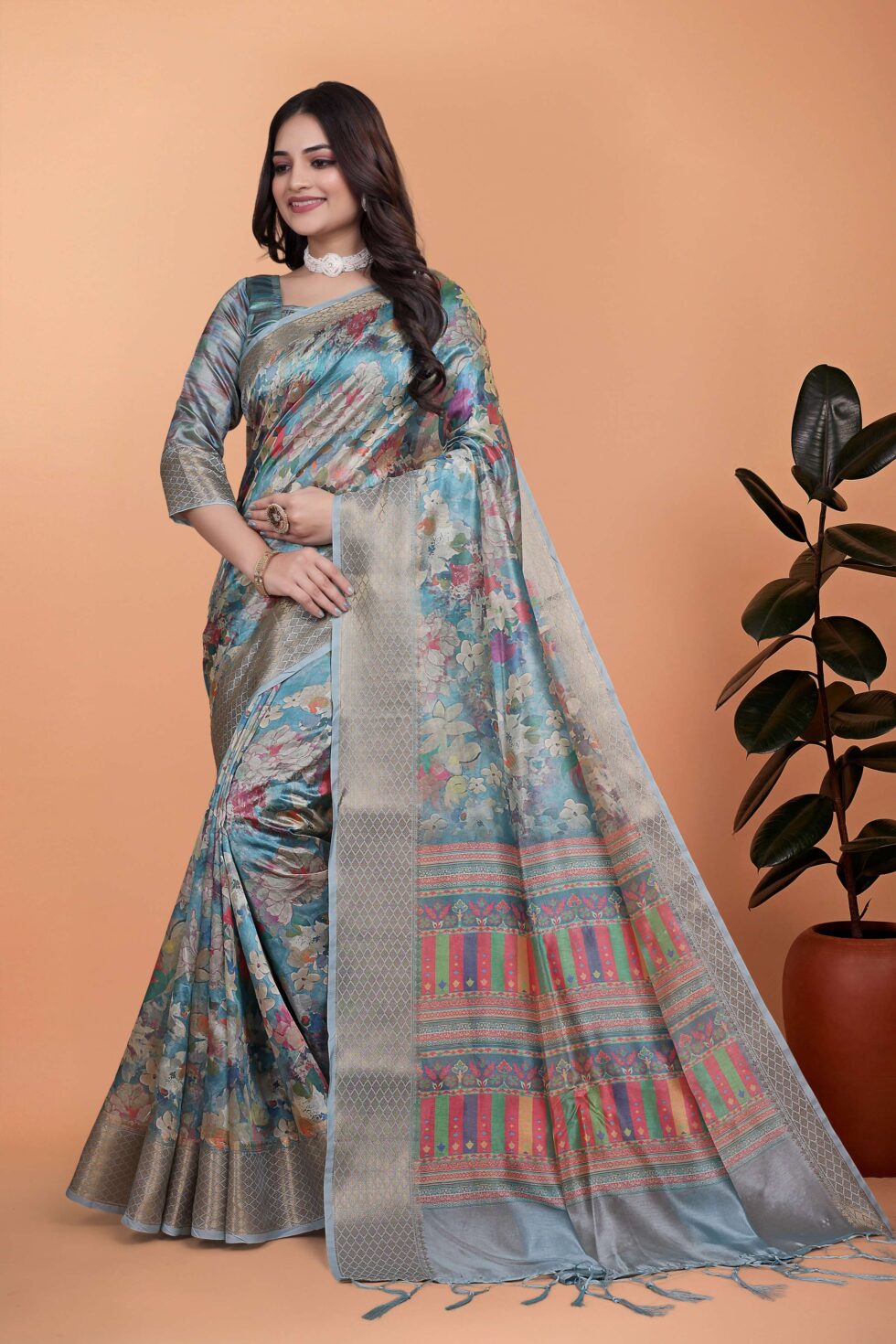 Sky Blue Floral Soft Silk Saree with Multicolor Pallu
