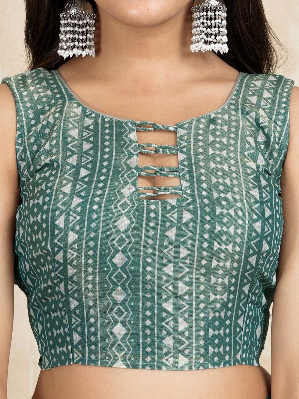 This unique linen saree features a stylish olive green body with a geometric print, beautifully contrasted by a teal pallu with a delicate white floral design. It’s a modern and elegant choice for a sophisticated look.