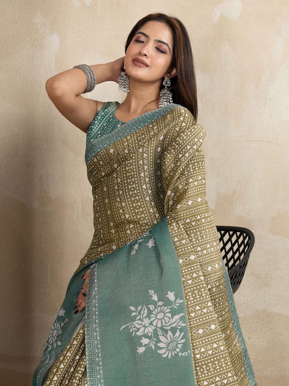 Stylish Olive Green and Teal Linen Saree with Geometric and Floral Prints