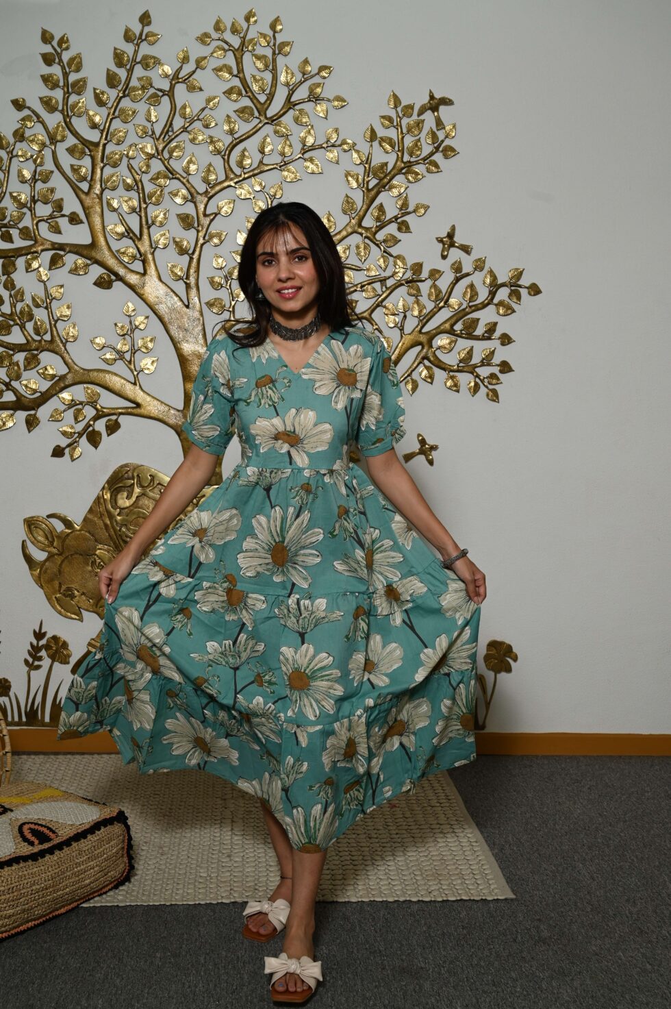 ffortless elegance with this Teal-Blue cotton anarkali maxi dress featuring a vibrant floral print, puff sleeves, and a flattering fit-and-flare design. Perfect for casual outings, brunches, and vacation styling.
