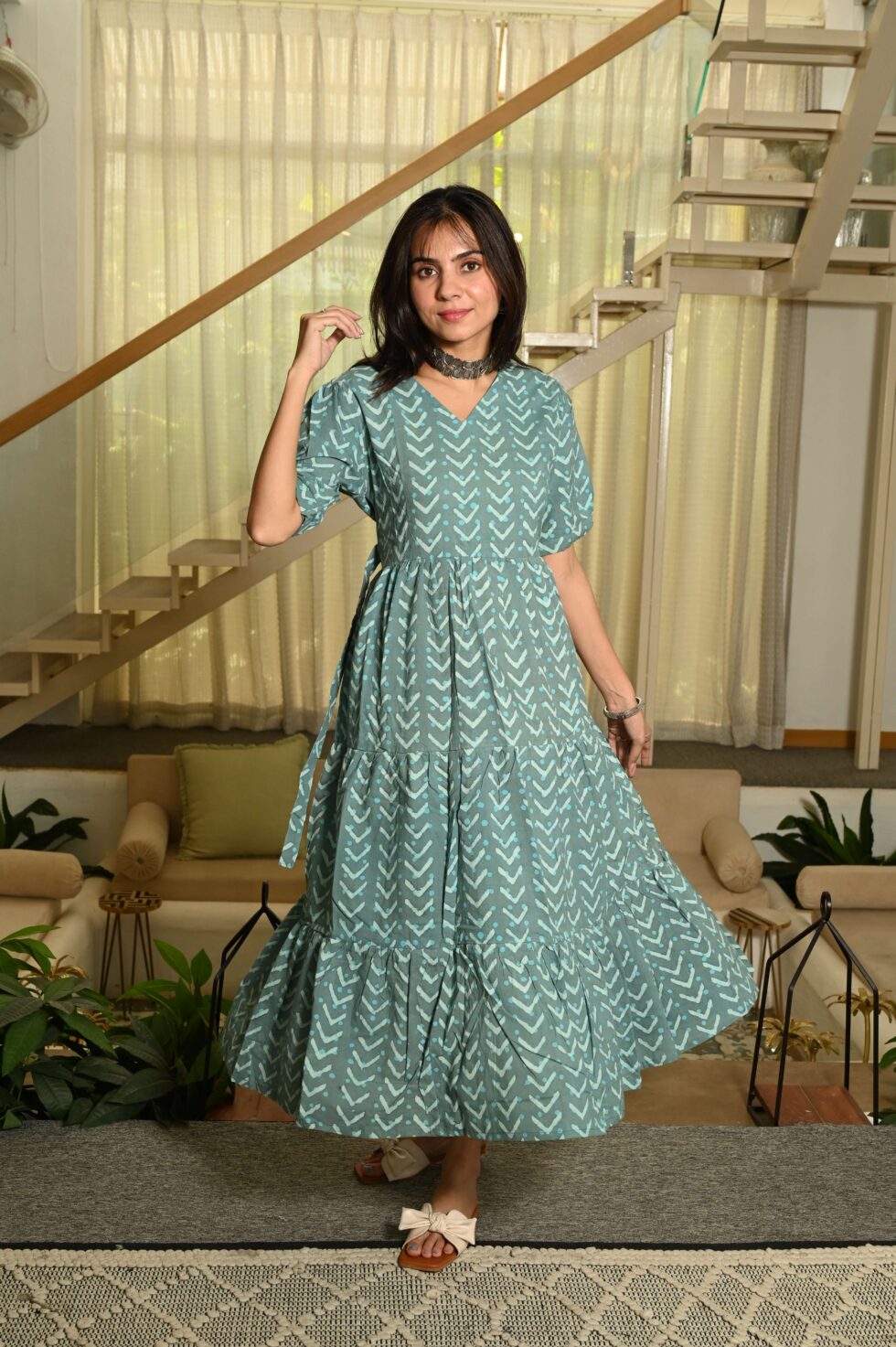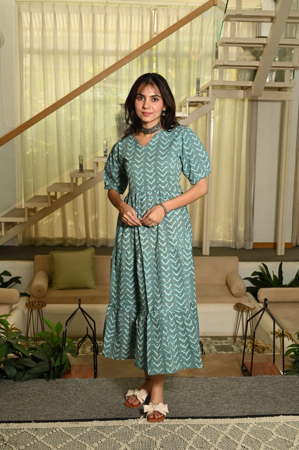 Teal Green Printed Cotton Maxi Dress, designed for women who love a mix of comfort and style. Crafted from soft, breathable cotton, this dress features an elegant teal base with modern geometric prints, making it a versatile pick for multiple occasions.