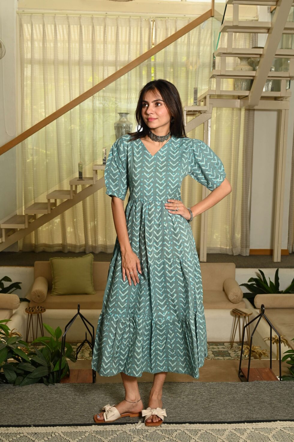 Look effortlessly chic in this teal green cotton maxi dress with geometric prints, puff sleeves, and a flattering flared hem. Perfect for casual outings, festive gatherings, and vacation styling.