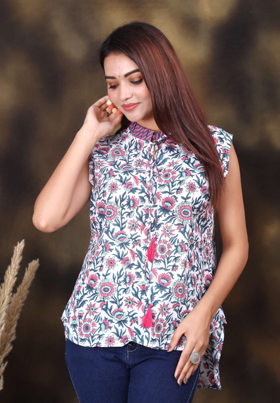 Bring freshness to your style with this white floral printed sleeveless cotton top for women, featuring a delicate multicolor flower design and a trendy tie-up neckline. The lightweight fabric ensures all-day comfort, making it a perfect choice for summer wear, office outfits, or casual outings. Pair it with jeans, trousers, or skirts to create a chic and effortless look.