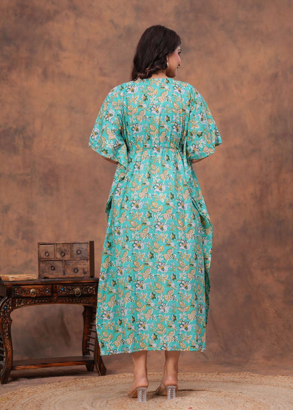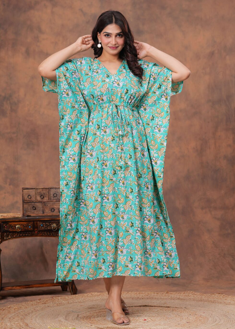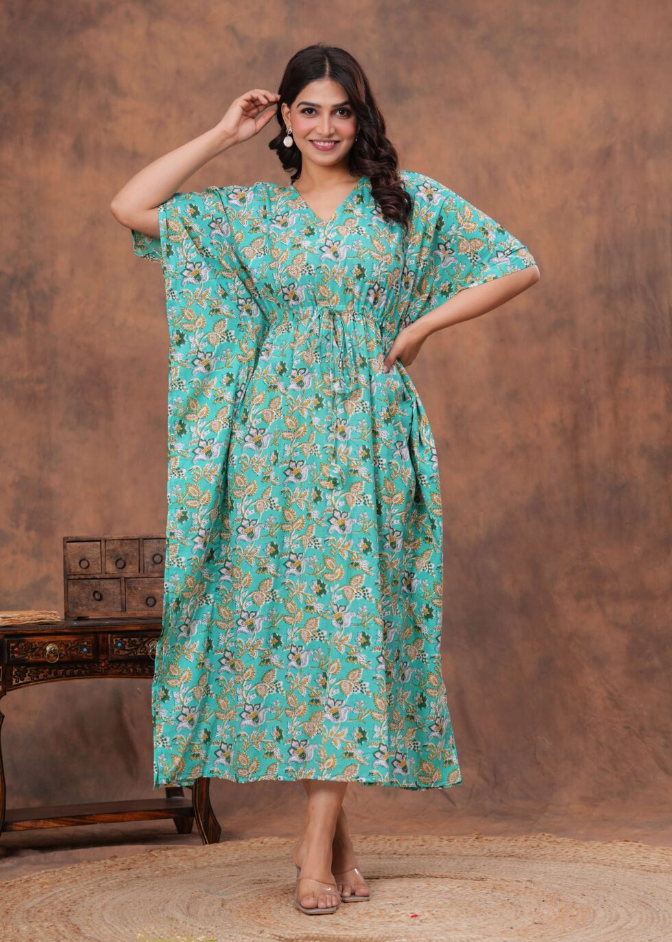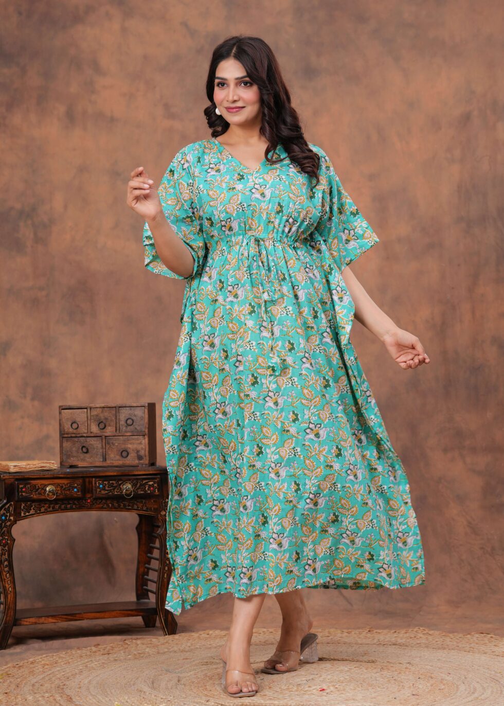Stylish cotton kaftan dress with soft breathable fabric, adjustable drawstring waist, and relaxed fit. Perfect for casual outings, vacations, or lounging in comfort.
