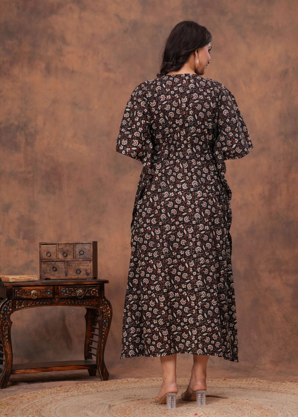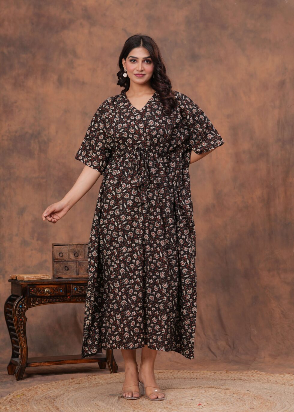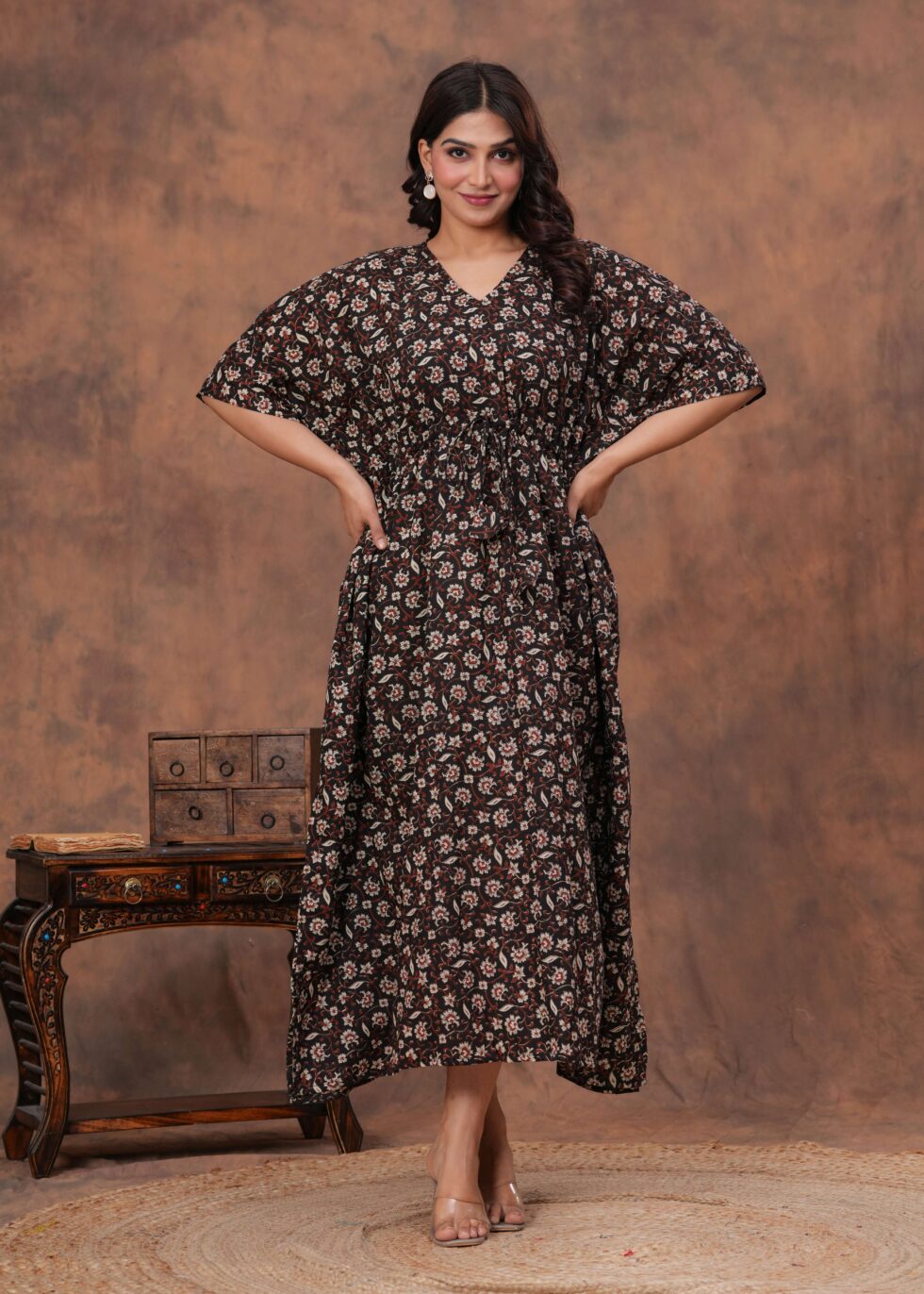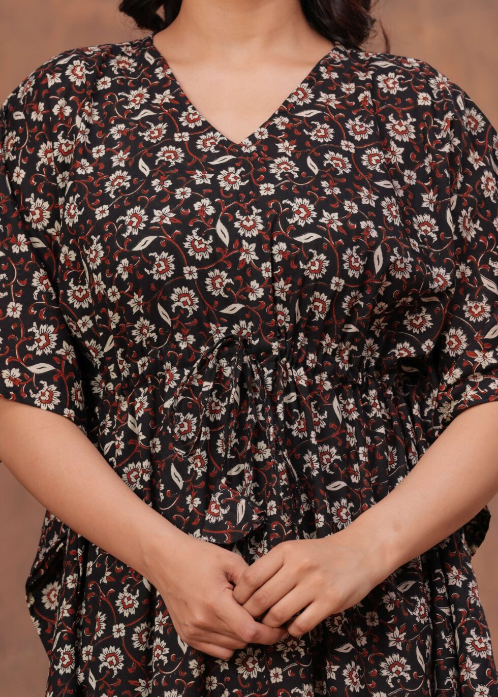 Women’s Black Cotton Floral Printed Kaftan Dress with Drawstring Waist