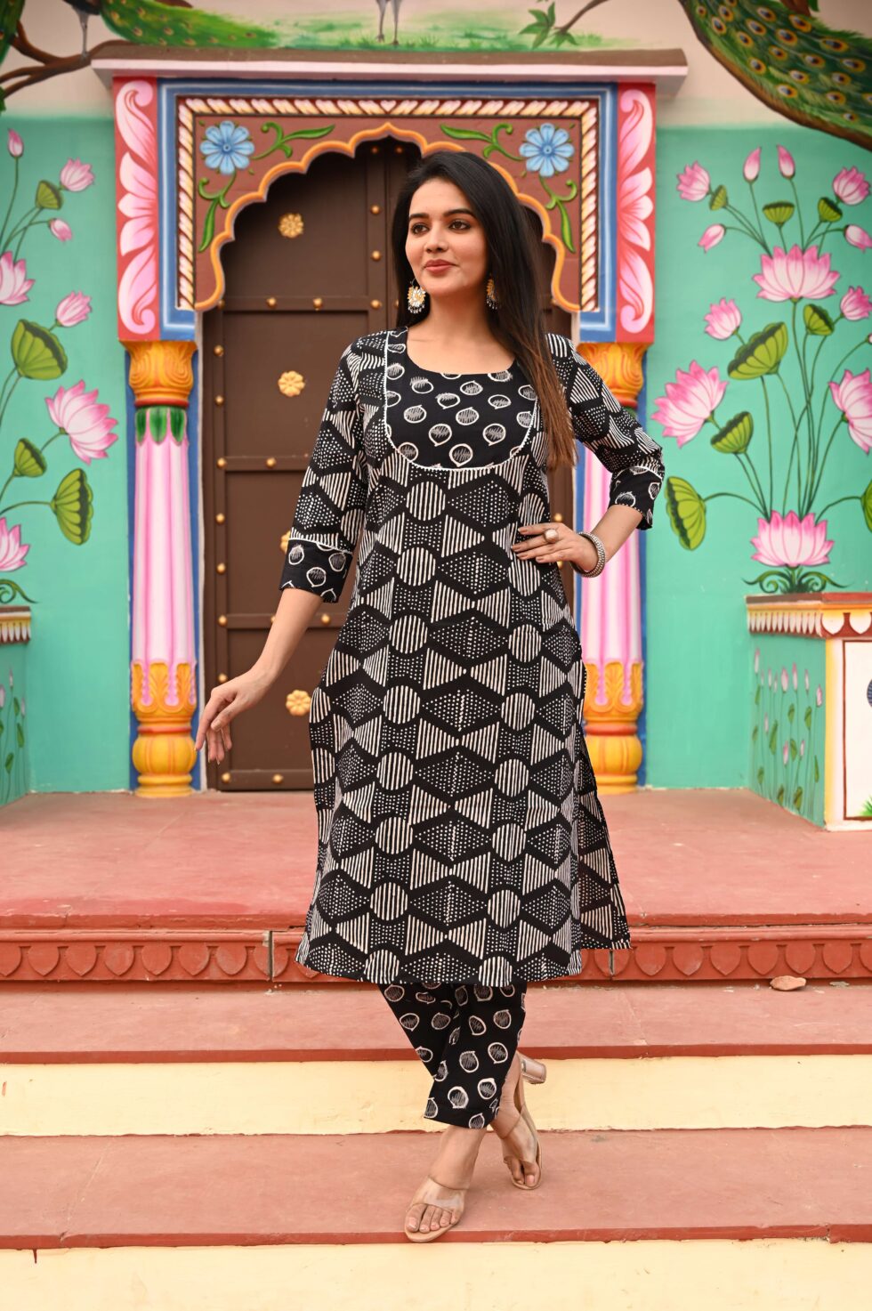 Elegant black cotton kurta set featuring white handblock prints and a contrast patterned yoke. Perfect for office wear, festive occasions, or casual outings.