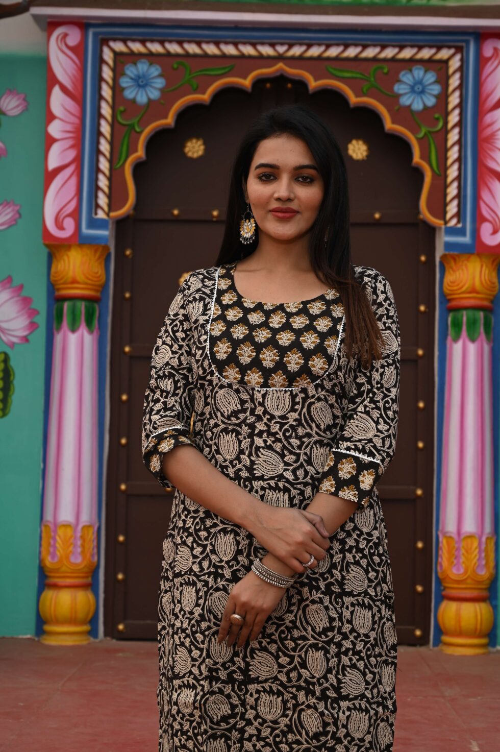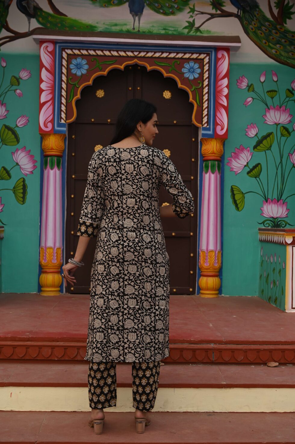 Elegant black cotton kurta set featuring white handblock prints and a contrast patterned yoke. Perfect for office wear, festive occasions, or casual outings.