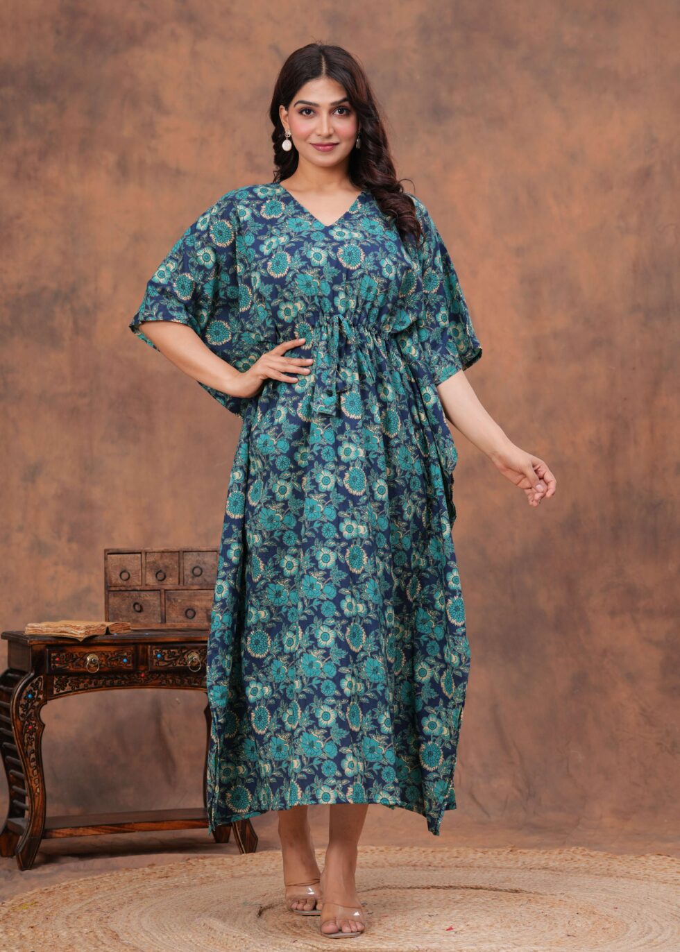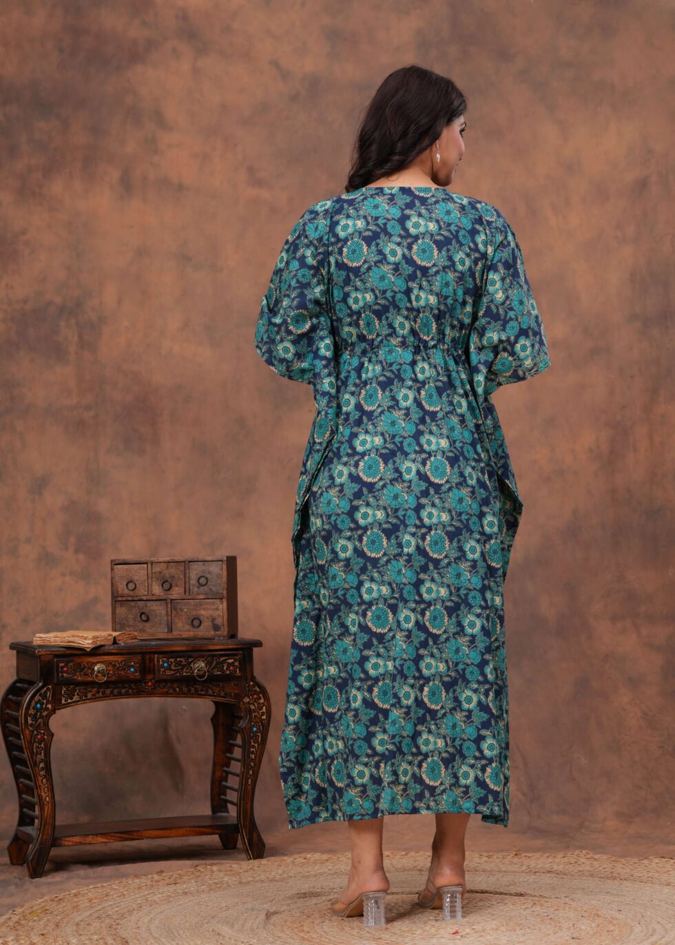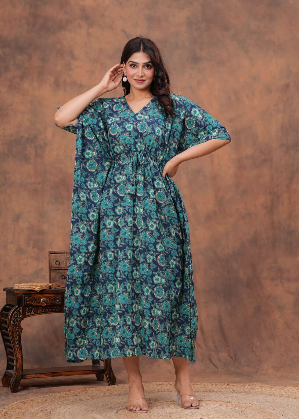 Women’s Blue Cotton Floral Printed Kaftan Dress with Drawstring Waist