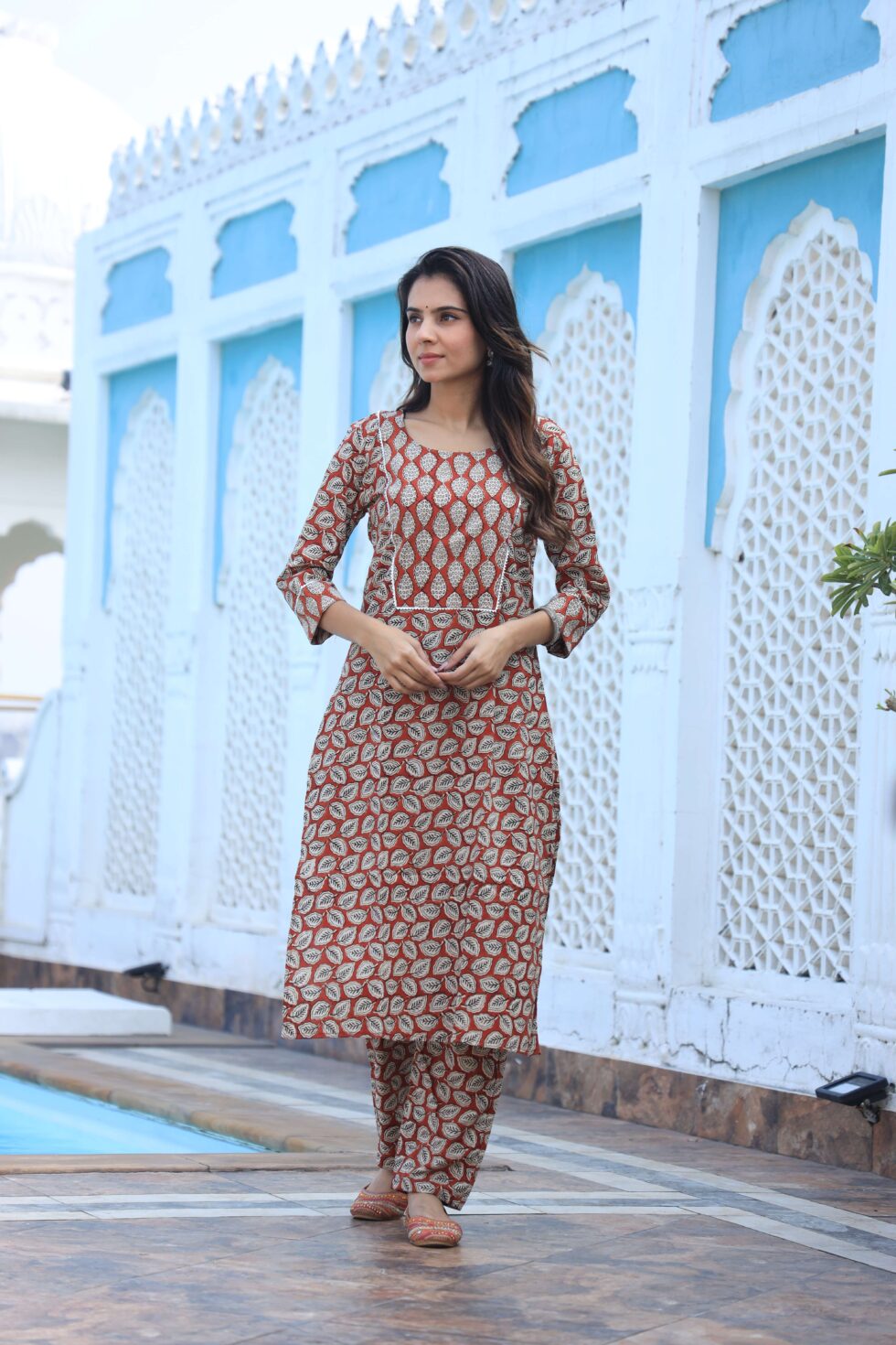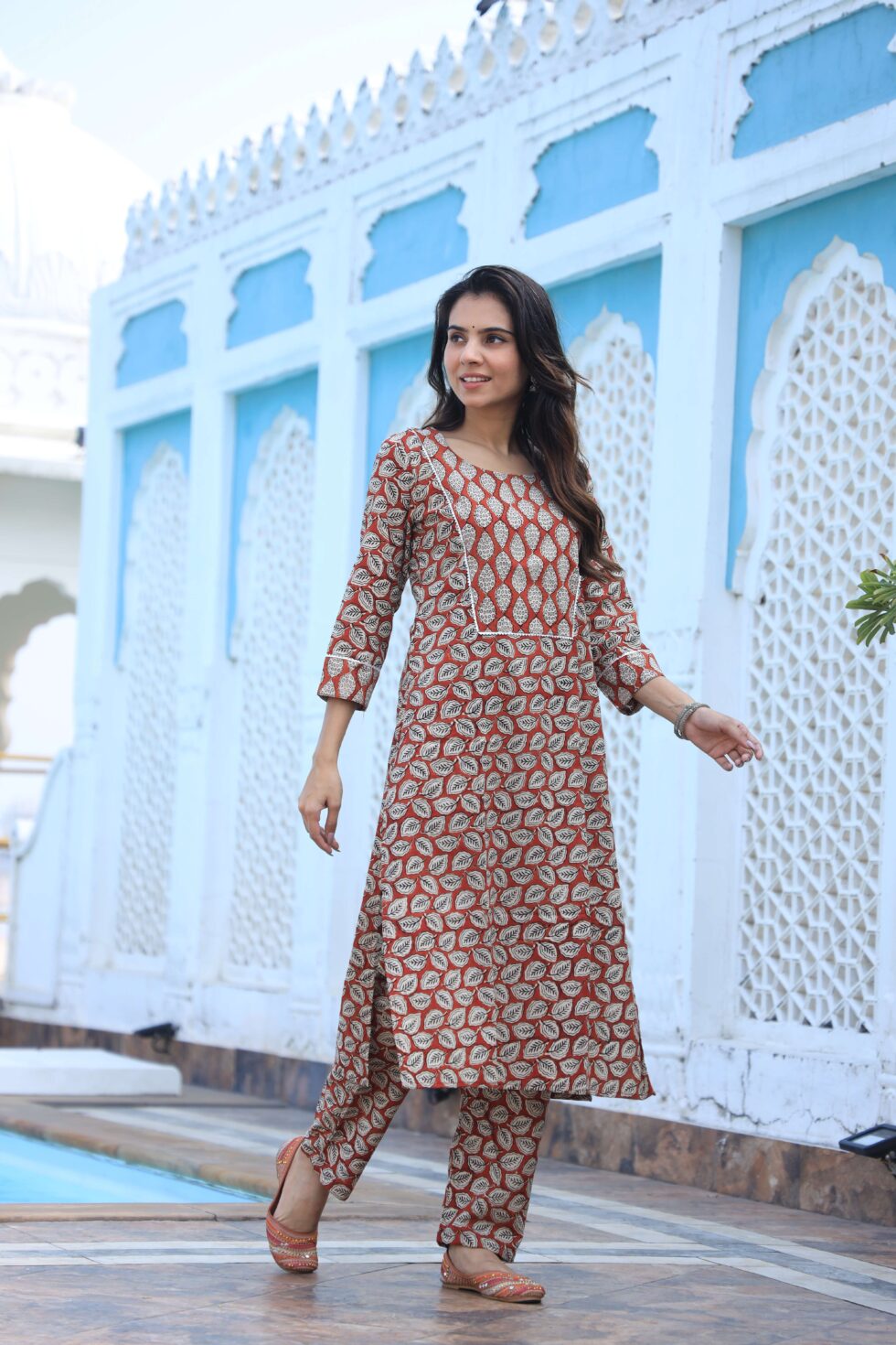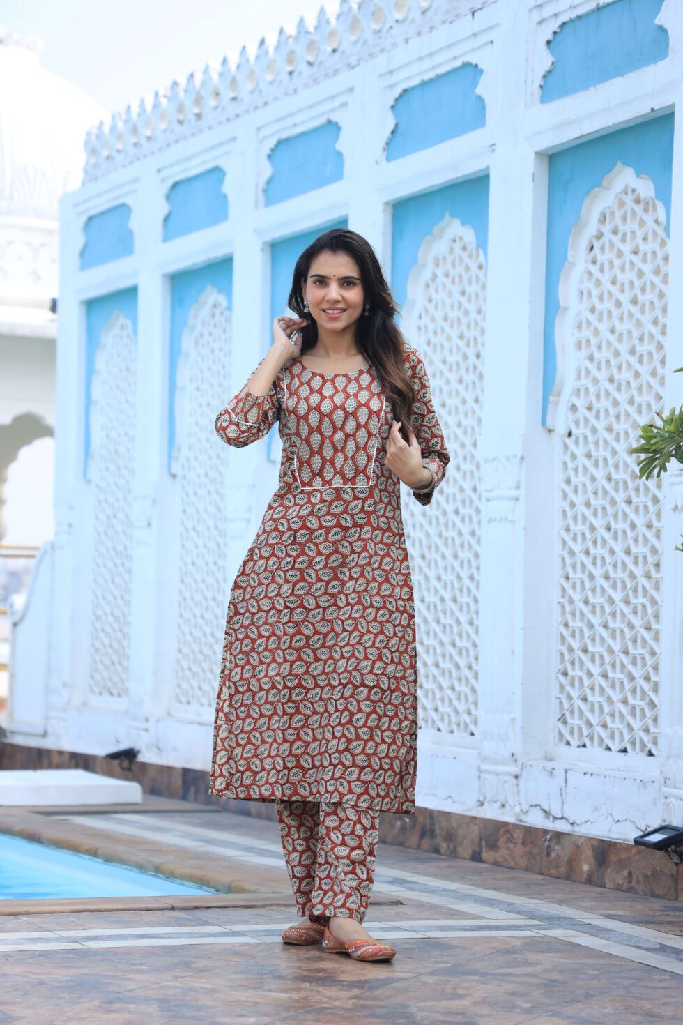 Elevate your ethnic style with this brown cotton printed kurta and pant set designed with intricate leaf motifs for a graceful touch. The kurta comes in a straight-cut silhouette with side slits, offering both style and ease of movement. Its matching printed pants complete the look, making it a coordinated and trendy outfit. Crafted from breathable cotton fabric, this kurta set ensures comfort all day long while keeping your look effortlessly chic. Ideal for workwear, casual outings, festive gatherings, and semi-formal occasions, this piece blends simplicity with sophistication.
