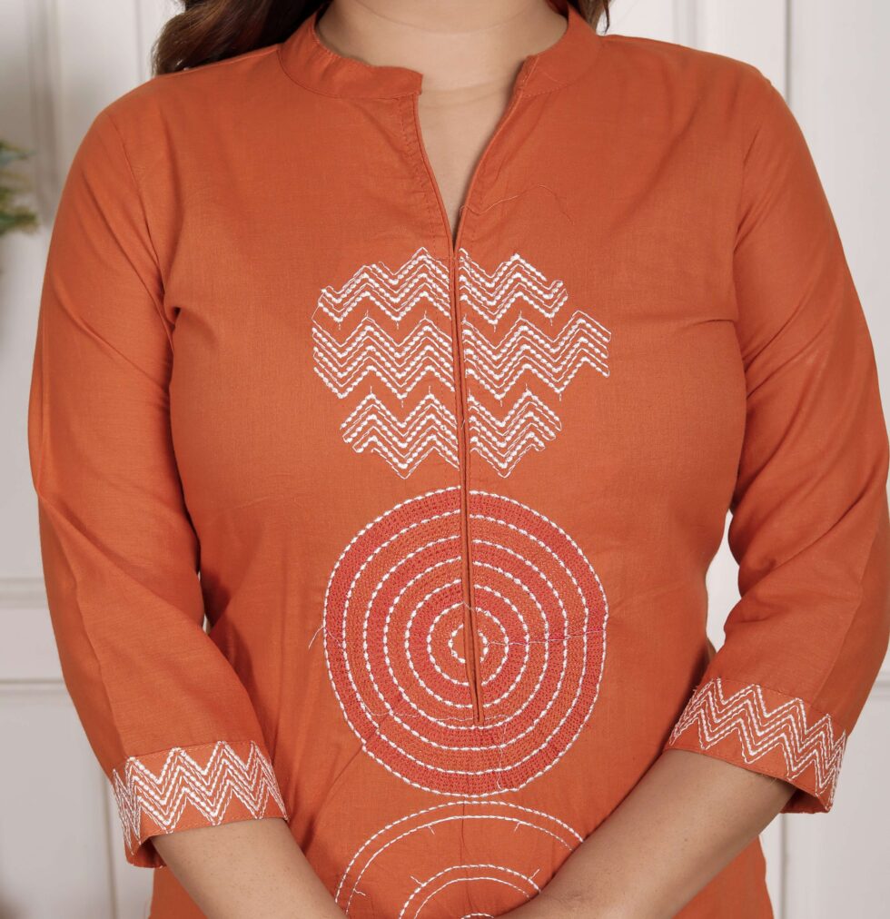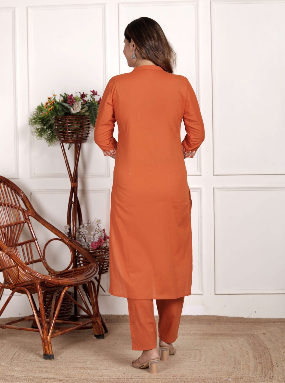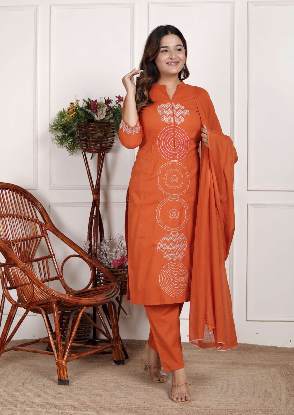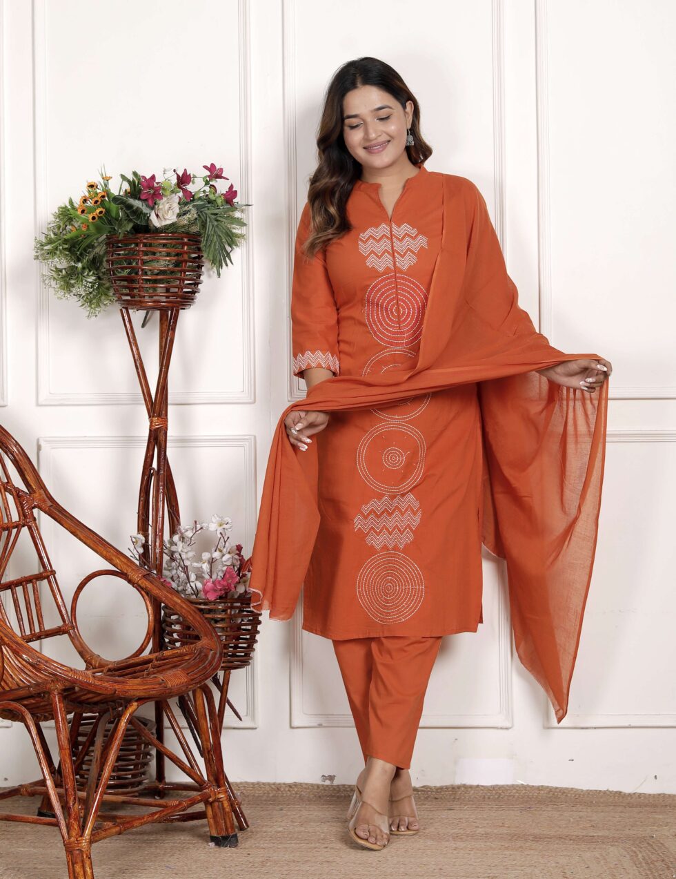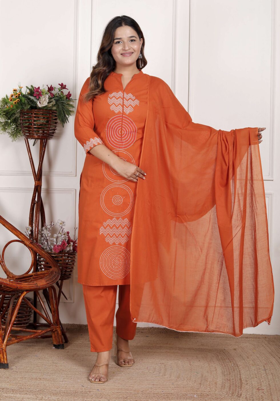 Women’s Cotton Printed Straight Kurti With Pant and Dupatta Set (DARK Orange)
